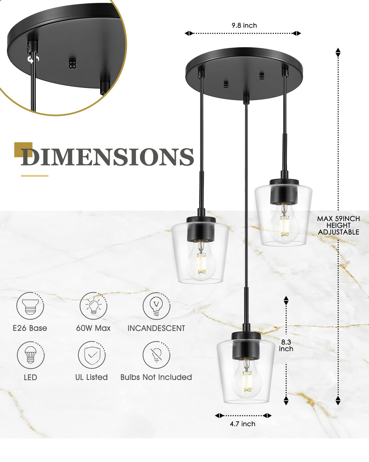 Audickic Cluster Pendant Light, A Ideal Blend Of Elegance And Simplicity. Crafted With Clear Glass Shades And Matte Black Metal, This Dining Room Light Fixture Exudes A Timeless Charm That Enhances Any Space It Graces. Add A Touch Of Sophistication And Warmth To Your Home With The 3-Light Dining Room Light Fixture Over Table. Specifications - Item Quantity: 1 Pack - Finish: Matte Black Finish - Material: Metal And Clear Glass Dimensions - Overall: 11.8''L X 11.8'' W X 59''H - Shade: F 4.72'' - Back Plate: F 9.85''