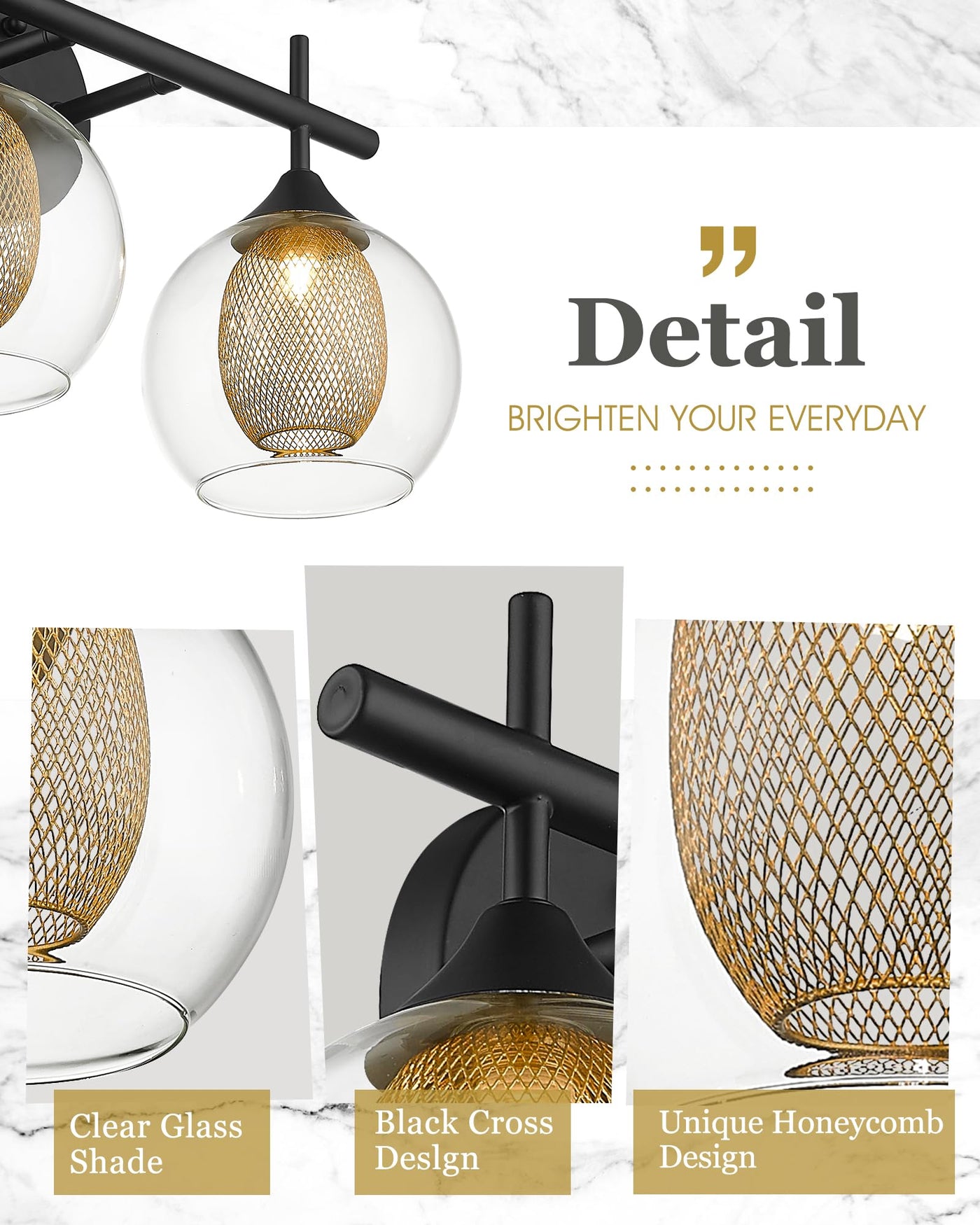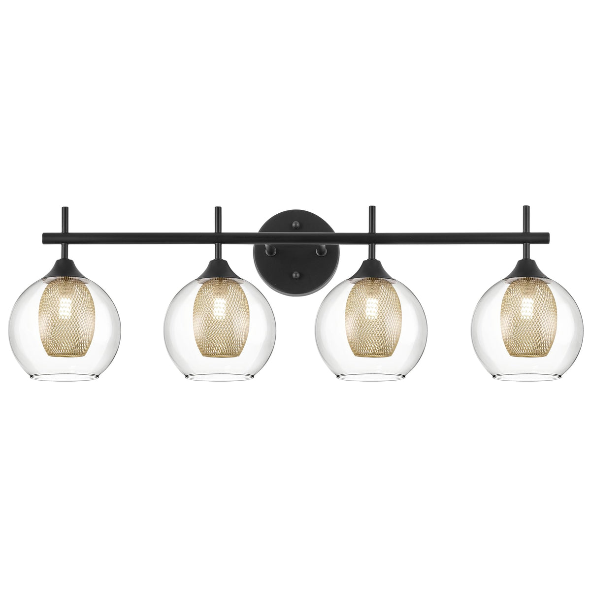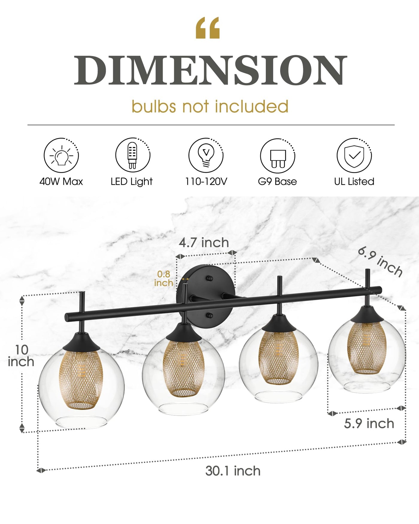The Audickic 4-Light 30-inch Bathroom Light Fixture, featuring a striking black and gold finish. This elegant design showcases dual shades crafted from clear globe glass, complemented by a unique honeycomb-inspired metal detailing. Ideal for adding a touch of sophistication to your bathroom decor. They are ideal for use as bathroom lighting fixtures over mirrors, vanity lighting fixtures, wall sconces, wall lights for bedrooms, etc. - Number of Items: 1 Pack - Finish: Matte Black and Gold - Material: Metal and Clear Glass - Light Source Type: G9 Bulbs - Wattage: 40W Max - Voltage: 120V - Overall: 30''L x 6.9''W x 10''H - Back Plate: F4.7''