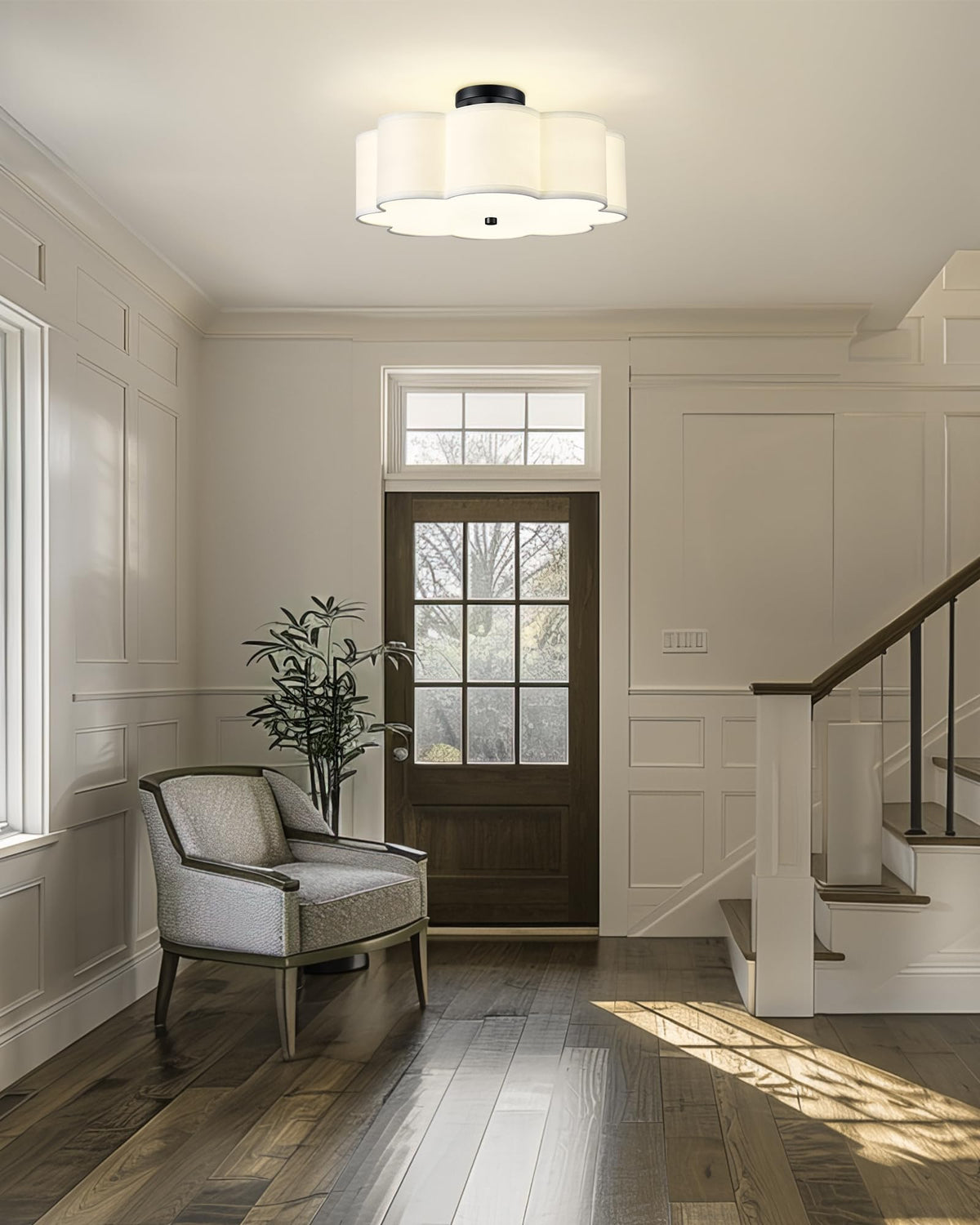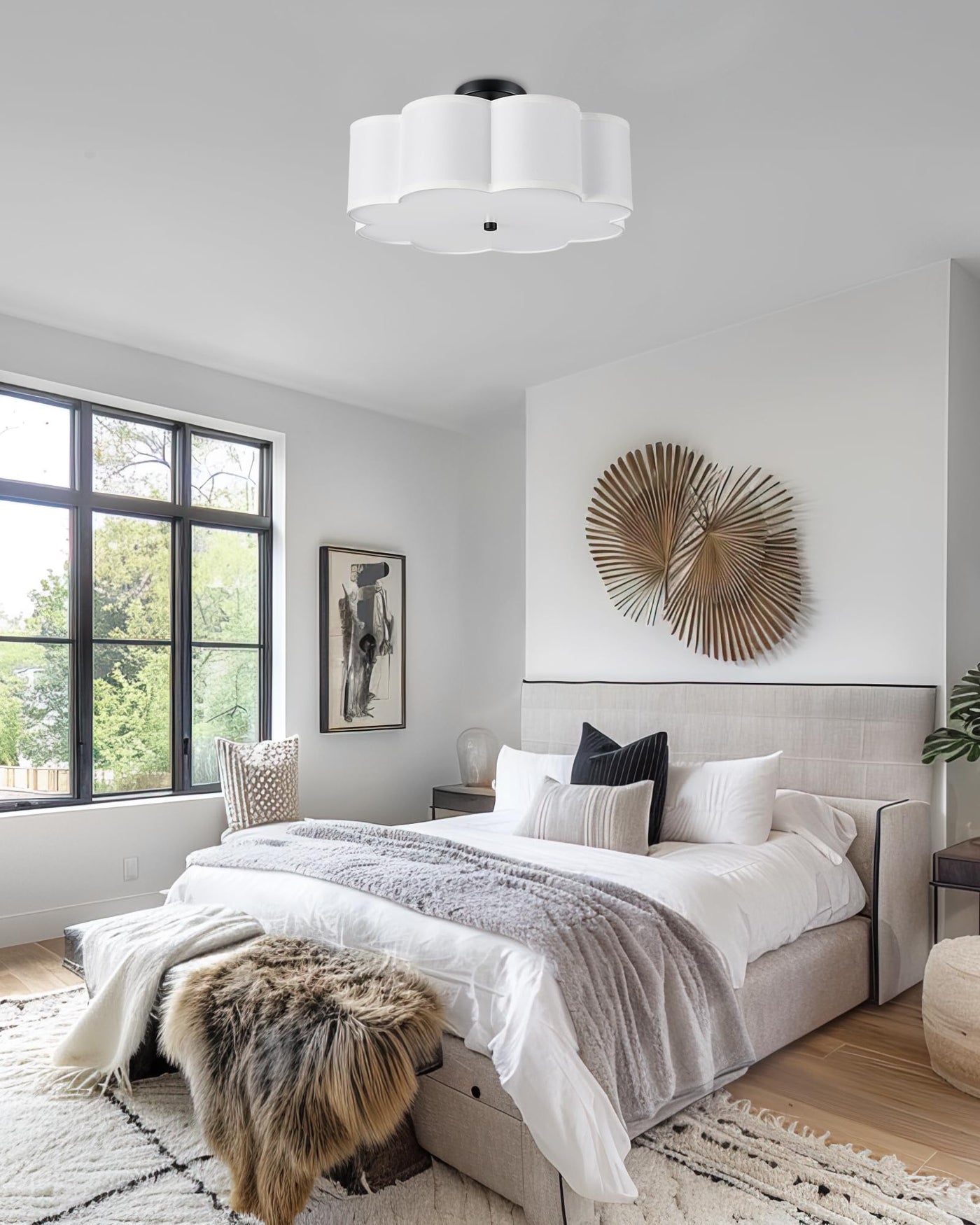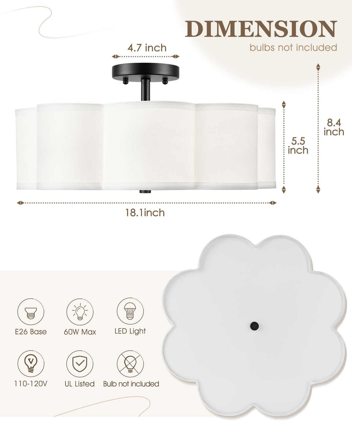 Audickic 4-Light 18inch Matte Black Semi Flush Mount Ceiling Light with Fabric Drum Shade in Flower Shape They are ideal for use as bathroom ceiling light, bedroom lights for ceiling, kitchen lighting fixtures ceiling, nursery close to ceiling light fixtures, living room flush mount ceiling light, hallway semi flush mount ceiling light, etc SPECIFICATIONS - Item Quantity: 1 Pack - Finish: Matte Black - Material: Metal and Fabric - Light Source Type: E26 Bulbs - Wattage: 60W Max - Voltage: 120V DIMENSIONS - Overall: 18''L x 18''W x 8''H - Back Plate: 5'' Dia