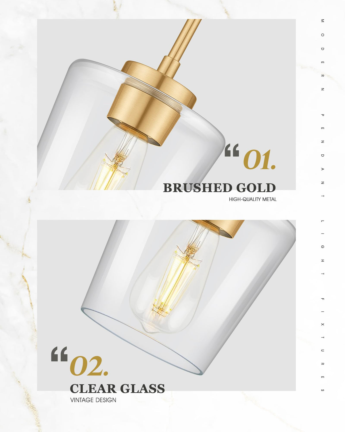 Q: What materials are used in the construction of these pendant lights?A: The Audickic Gold Pendant Lights feature a brushed gold metal finish and a clear glass shade, combining elegance and modern design. This construction enhances the stylish vibe of any space while showcasing the bulb's illumination.