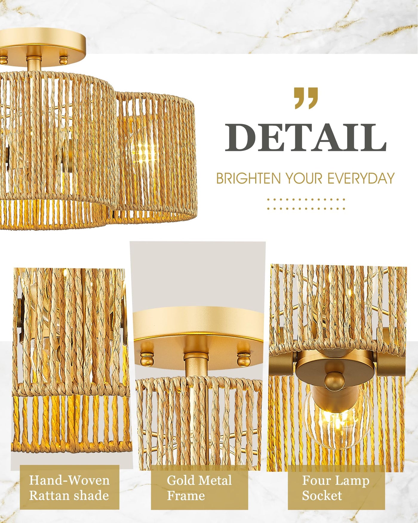 Audickic Rattan Light Fixtures Ceiling Mount, 4-Light 14'' Boho Semi Flush Mount Ceiling Light With Hand-Woven Shade In Quatrefo