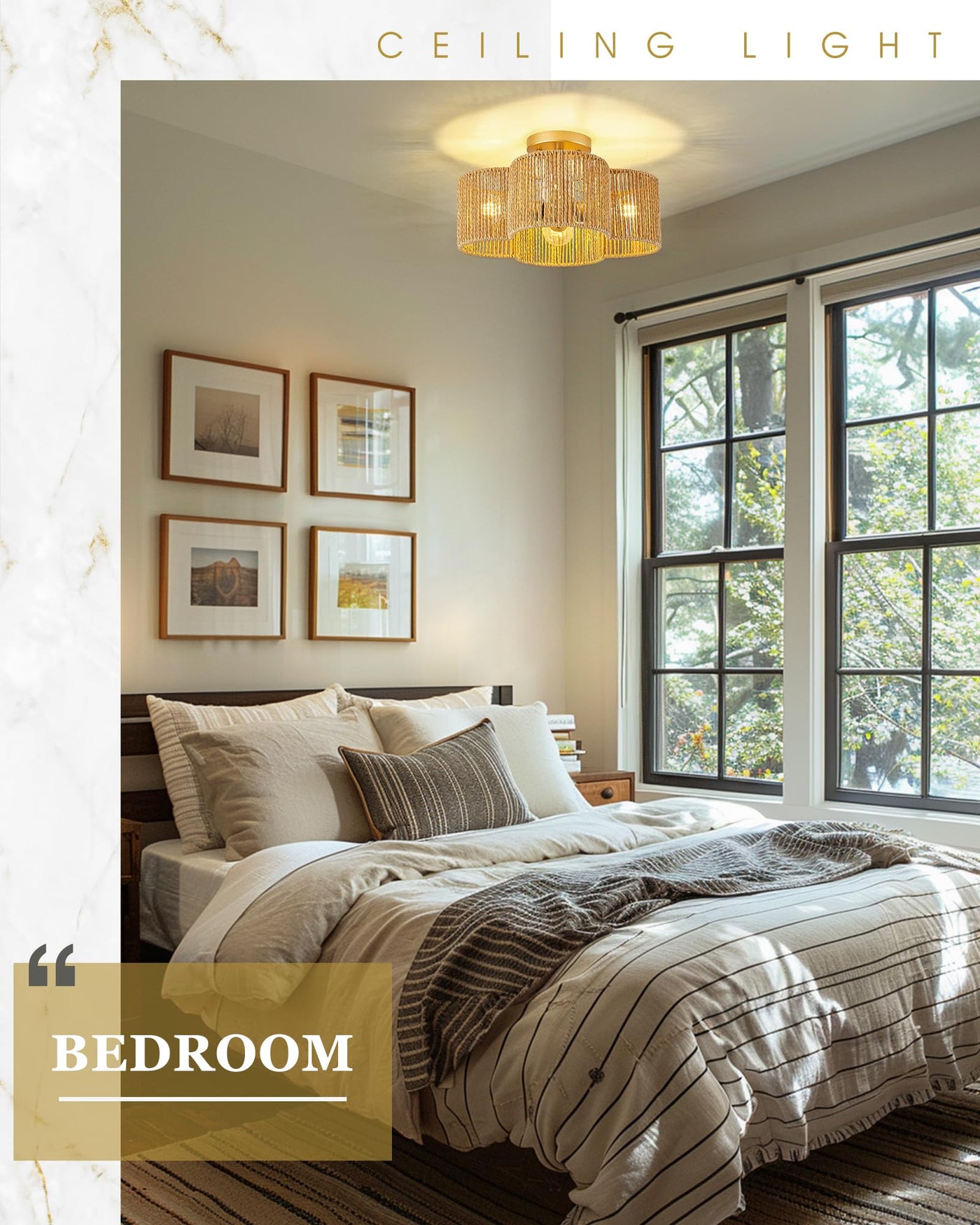 Q: What style is the Audickic Rattan Light Fixture designed for?A: This ceiling light fixture features a bohemian style with a hand-woven rattan shade in a quatrefoil shape, complemented by an elegant gold metal finish. It fits well in both contemporary and vintage-themed spaces, adding character to any room.