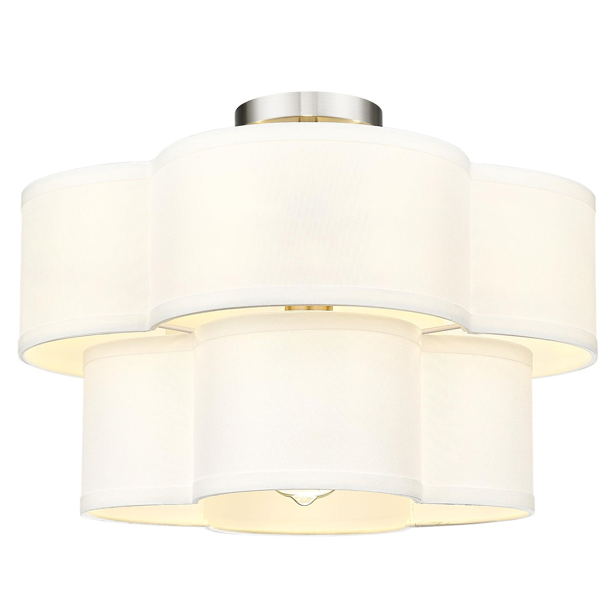Audickic 5-Light 18 inch Brushed Nickel Semi Flush Mount Ceiling Light with Double Fabric Drum Shade in Quatrefoil Shape SPECIFICATIONS - Item Quantity: 1 Pack - Finish: Brushed Nickel - Material: Metal and Fabric - Light Source Type: E26 Bulbs - Wattage: 60W Max - Voltage: 120V DIMENSIONS - Overall: 18''L x 18''W x 13''H - Back Plate: 5'' Dia