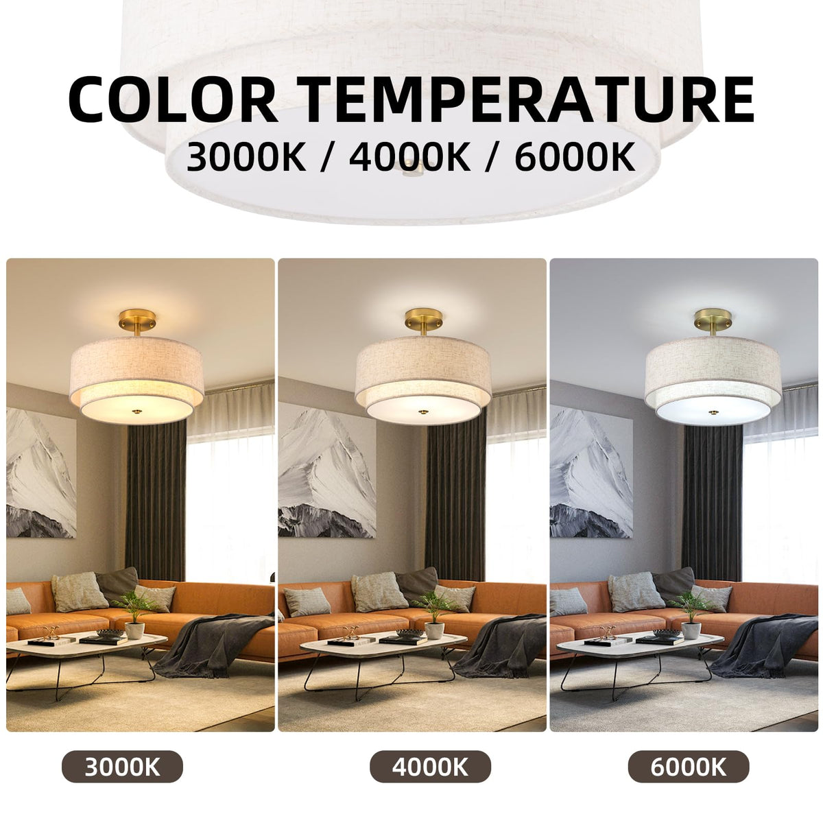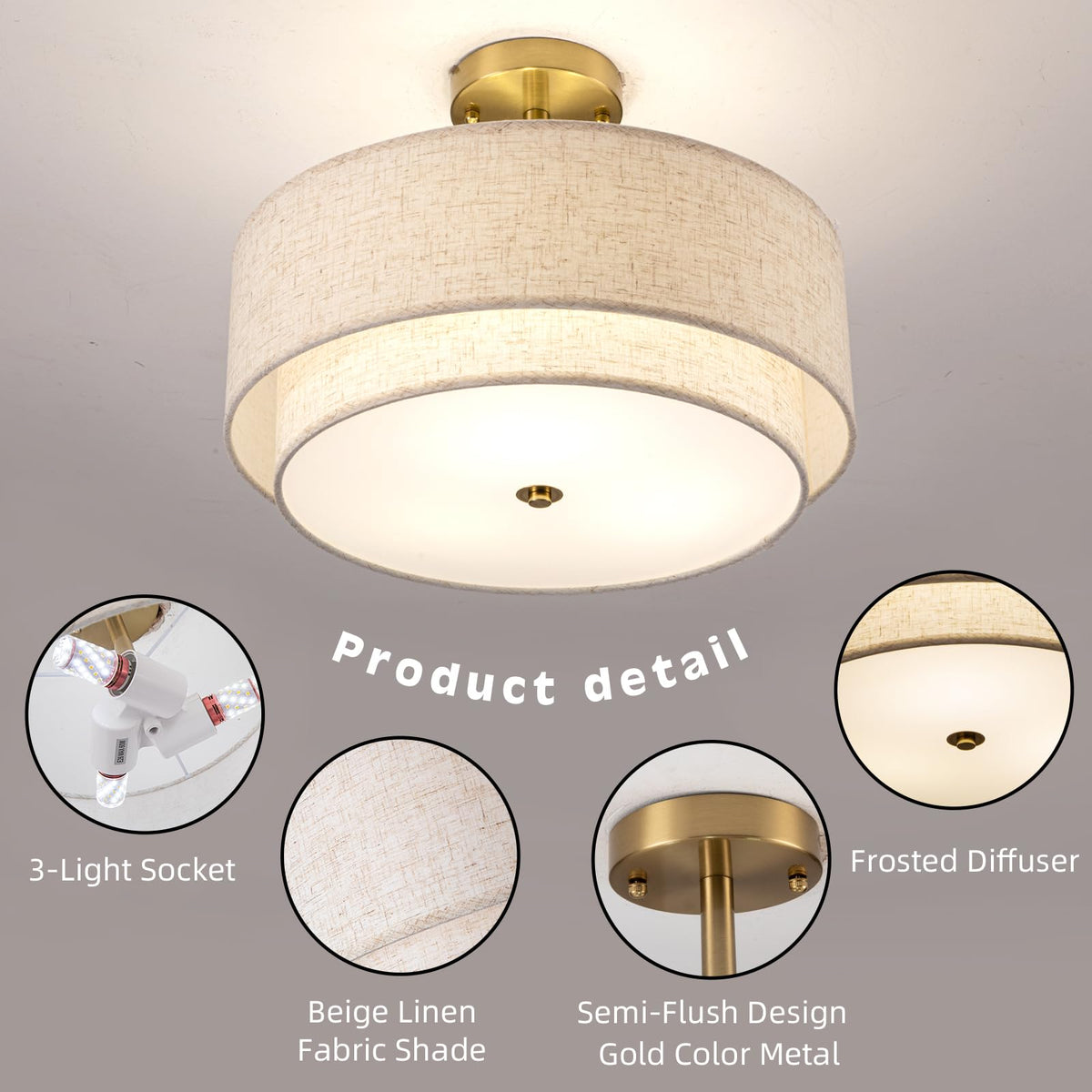 Elegant Design,Modern Style,Farmhouse Ceiling Lightingfeatures:Beige Color Double Linen Fabric Shade, Sturdy Construction ,Gold Brass Color Finishing Flush Mount 3 Light Close To Ceiling Light; Hard-Wired Needed. And All Parts Included For Easy Installation.This Drum Ceiling Light Will Lend Elegance To Your Space While Surrounding It With Relaxing Ambient Lightspecifications:Style:Modern Material: Metal Base And Drum Fabric Shade Color:Beige Fabric Shade,Gold Metal Base Base:3* E26 Bulb Base(Note: Bulb Not Included)Wattage: Max 60W Each Voltage: Ac 120Vdimensions:Light Fixture: Diameter 16Inch X Height 12Inchpackage Included: 1X Full Kit Of Ceiling Light(Bulb Not Included) 1X Installation Instructionaplications: Home: Kitchen,Dining Room,Living Room,Foyer,Doorway,Hallway,Entryway,Kids Room, Bedroomoffice:Meeting Room, Conference Room, Workspace, Pantry, Front Desk, Exhibition Room. Others: Restaurants,Bars, Pubs, Coffee Shops,Liberaries,Shops,Etc.We Suggest Installation By Alicensed Electrician.