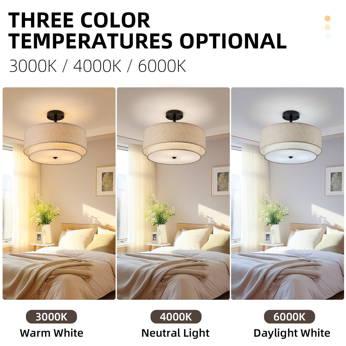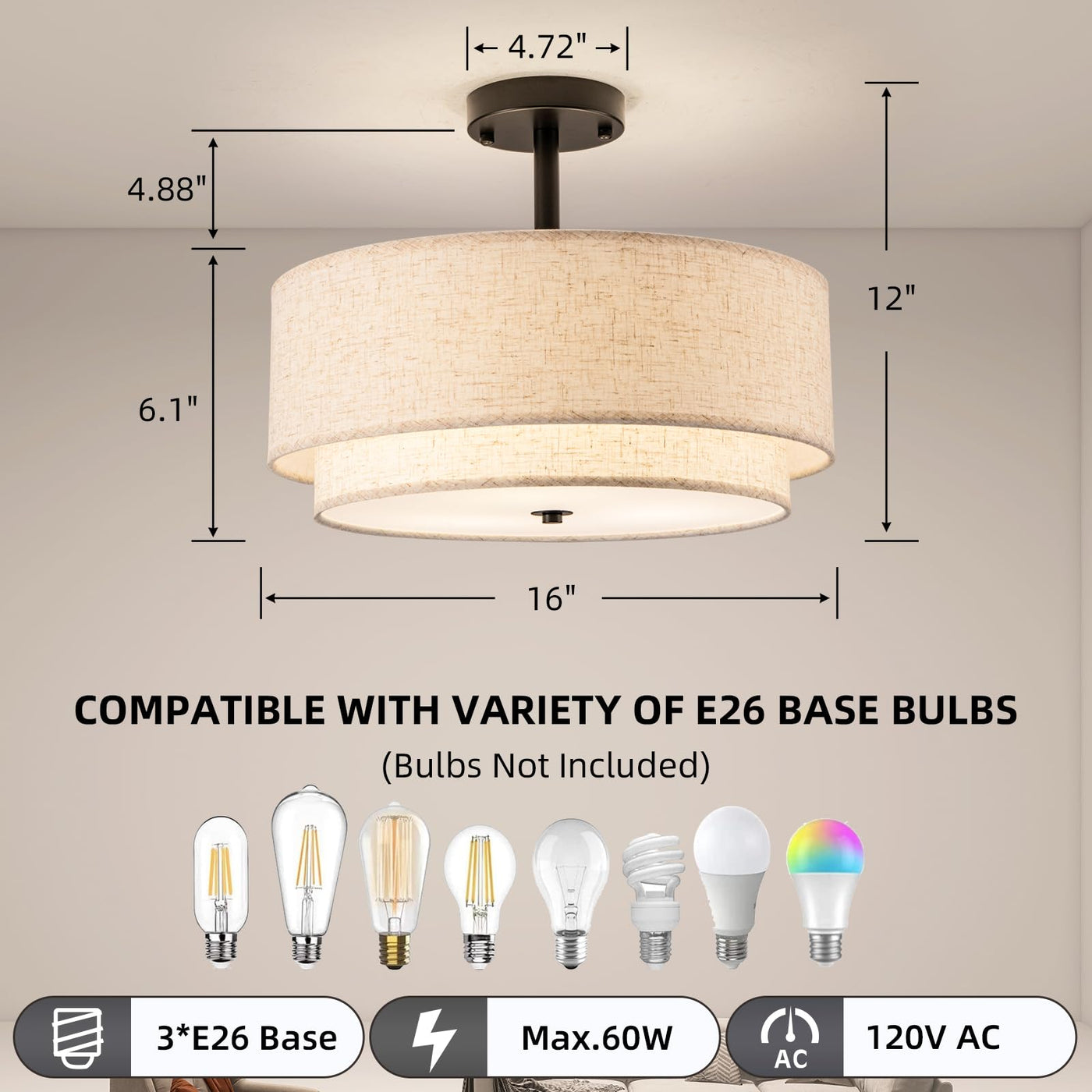 Elegant Design,Vintage Style,Farmhouse Ceiling Lightingfeatures:Beige Color Double Linen Fabric Shade, Sturdy Construction ,Black Color Finishing Flush Mount 3 Light Close To Ceiling Light; Hard-Wired Needed. And All Parts Included For Easy Installation.This Drum Ceiling Light Will Lend Elegance To Your Space While Surrounding It With Relaxing Ambient Lightspecifications:Style:Modern Farmhouse Material: Metal Base And Drum Fabric Shade Color:Beige Fabric Shade,Black Metal Base Base:3* E26 Bulb Base(Note: Bulb Not Included)Wattage: Max 60W Each Voltage: Ac 120Vdimensions:Light Fixture: Diameter 16Inch X Height 12Inchpackage Included: 1X Full Kit Of Ceiling Light(Bulb Not Included) 1X Installation Instructionaplications: Home: Kitchen,Dining Room,Living Room,Foyer,Doorway,Hallway,Entryway,Kids Room, Bedroomoffice:Meeting Room, Conference Room, Workspace, Pantry, Front Desk, Exhibition Room. Others: Restaurants,Bars, Pubs, Coffee Shops,Liberaries,Shops,Etc.We Suggest Installation By Alicensed Electrician.
