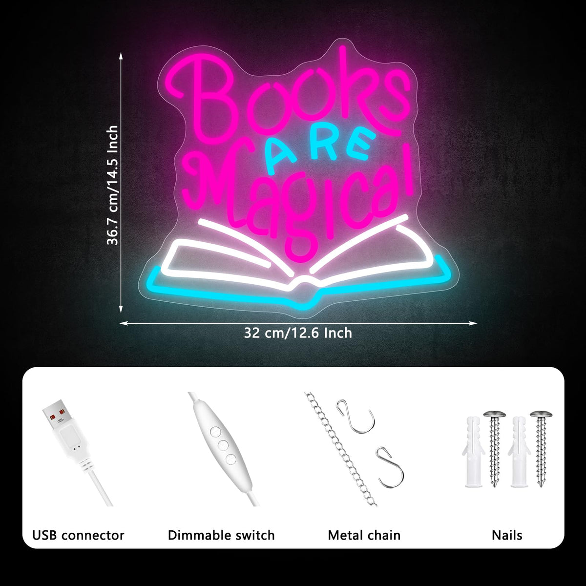 Q: What are the dimensions of the AUGELRE Books are Magical Neon Sign?A: The AUGELRE Books are Magical Neon Sign does not have specified dimensions listed. However, it is designed to be a prominent decorative piece suitable for various spaces.