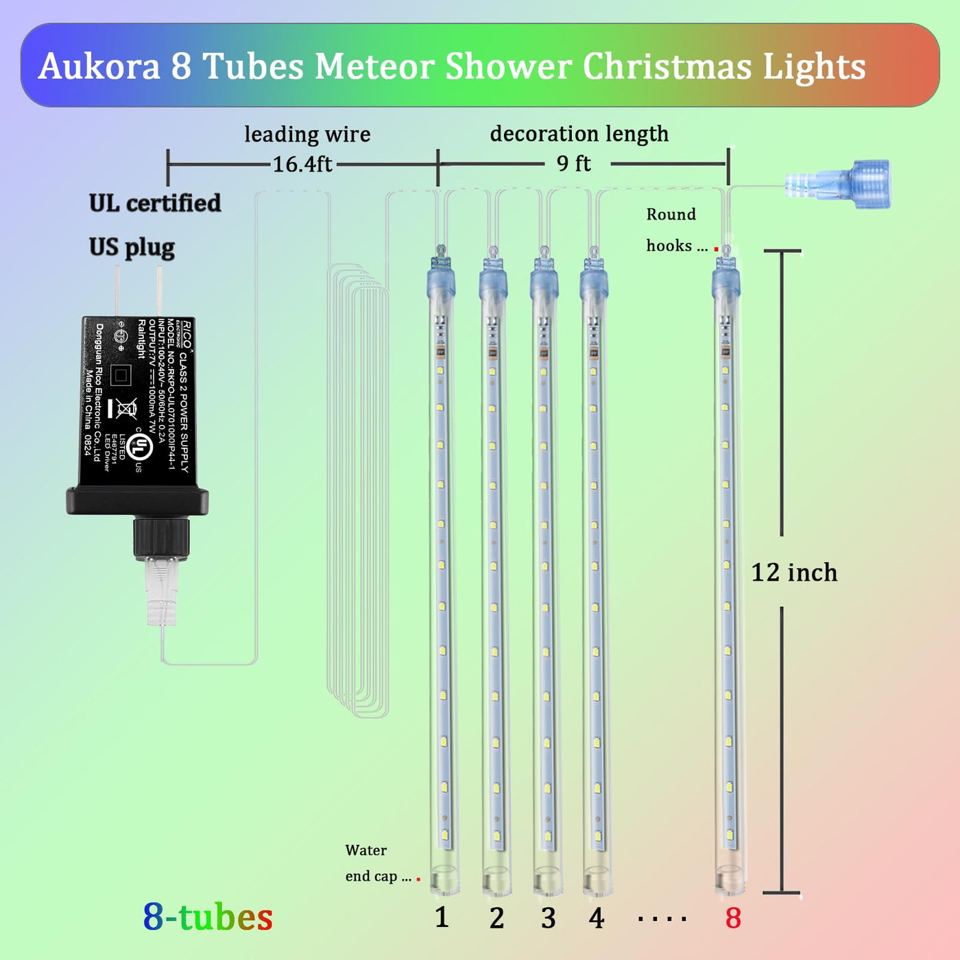 Enjoy Your Colorful Life, Just Start From Aukora! Specs: Plug types: UL Plug LED bulbs of per tube: 24 Tube Qty : 8 Tubes Number of LED bulbs : 8 Tubes x 24LED (192LED Lights) Tube length: 30cm Tube Dia.: 1cm Total length :820cm Working Voltage: 100-240V Watt: 5W Features: 1.Meteor shower effect, romantic aesthetic 2.Linkable to multiple sets 3.The materials are environmental protection,energy saving and safe 4.Waterproof, dustproof, corrosion resistant Noted: 1. Please note that the plug is NOT waterproof so that please keep the plug away from water 2. Please make sure the male/female connectors are connected correctly. If you can not turn on the whole light or 8 tubes, it is caused by the false connection for the connectors, please disconnect them and change another direction to connect them again