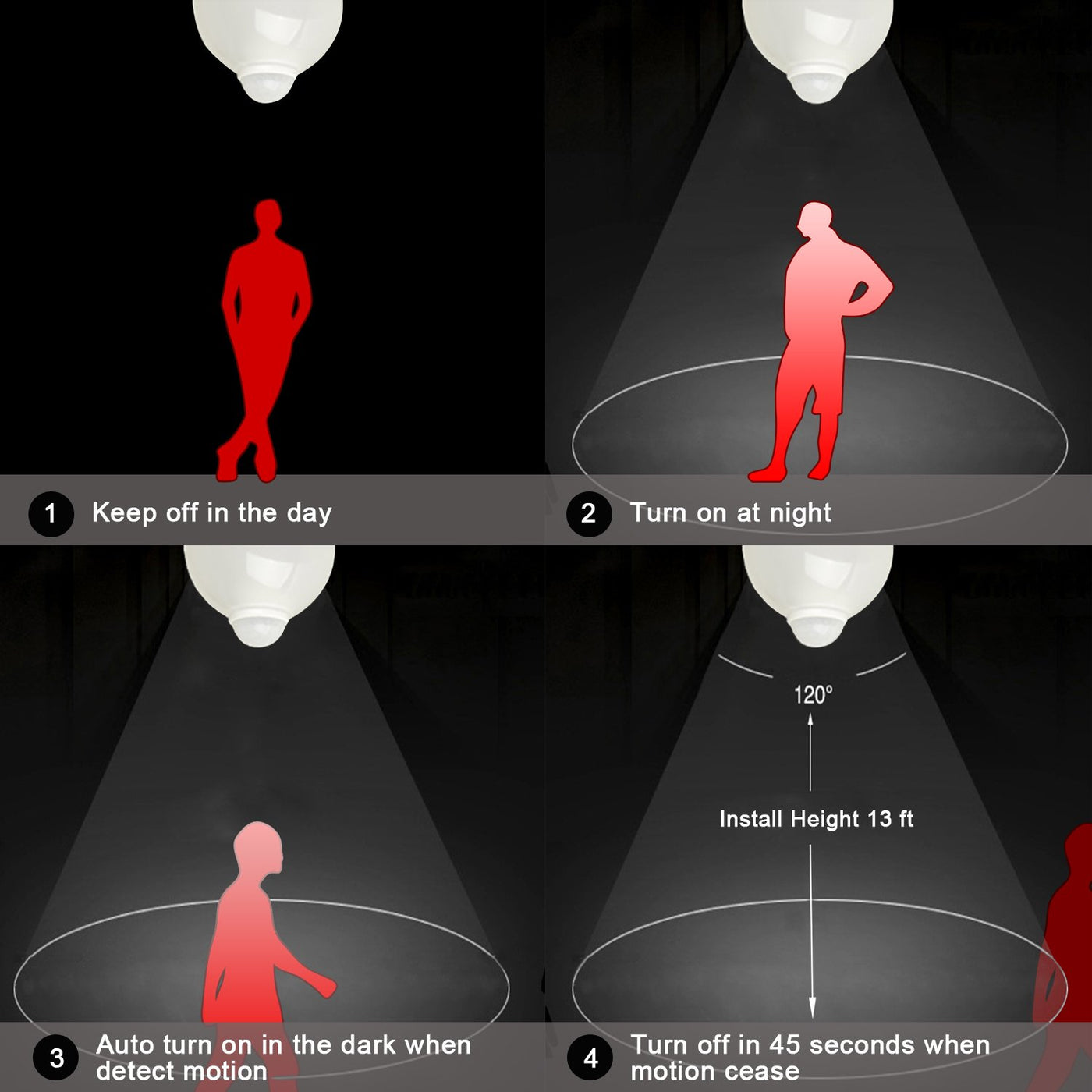 Q: How does the motion sensor work on the Aukora light bulb?A: The Aukora motion sensor light bulb uses a high-quality PIR infrared sensor that detects motion within a range of eight to ten feet in the dark. When motion is detected, the bulb automatically turns on and will remain lit for about sixty seconds after the motion ceases.