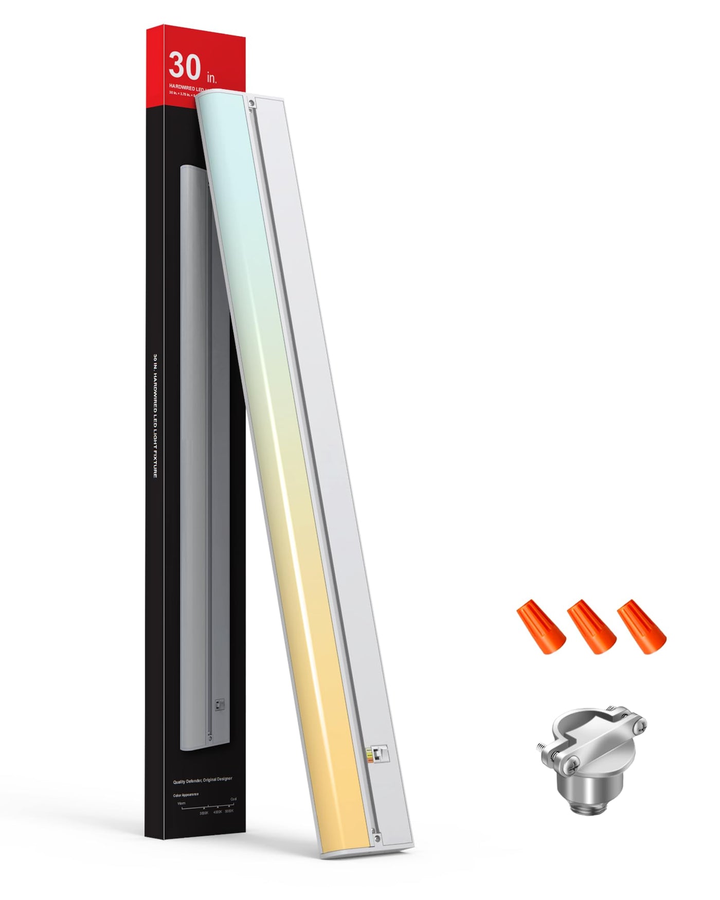 THE PERFECT LED UNDER CABINET LIGHTING KIT Suitable for mounting to any desired surface, including cabinets, counters or closets. Accessories include mounting screws, wire nuts, and conduit connector ADJUSTABLE COLOR TEMPERATURE This stunning LED Under Cabinet Fixture is constructed with an aluminum housing and has a slide selector switch for changing Kelvin colour temperature (3000K/4000K/5000K) POWERFUL FUNCTION 1 inch low profile design means the fixture remains hidden. The quality of light is the best in the Industry with a 90 color rendering index (CRI) and up to 87 lumens per watt. This fixture has a LED life of 50,000 hours and dimmable with most ELV dimmers WIDE APPLICATION Perfect for the kitchen and other locations: cabinets, countertops, bookcases, wardrobes, shelving units, and closets! Ideal for creating a cozy atmosphere in your home and increasing the quality of lighting when working in the kitchen or being productive in your home office