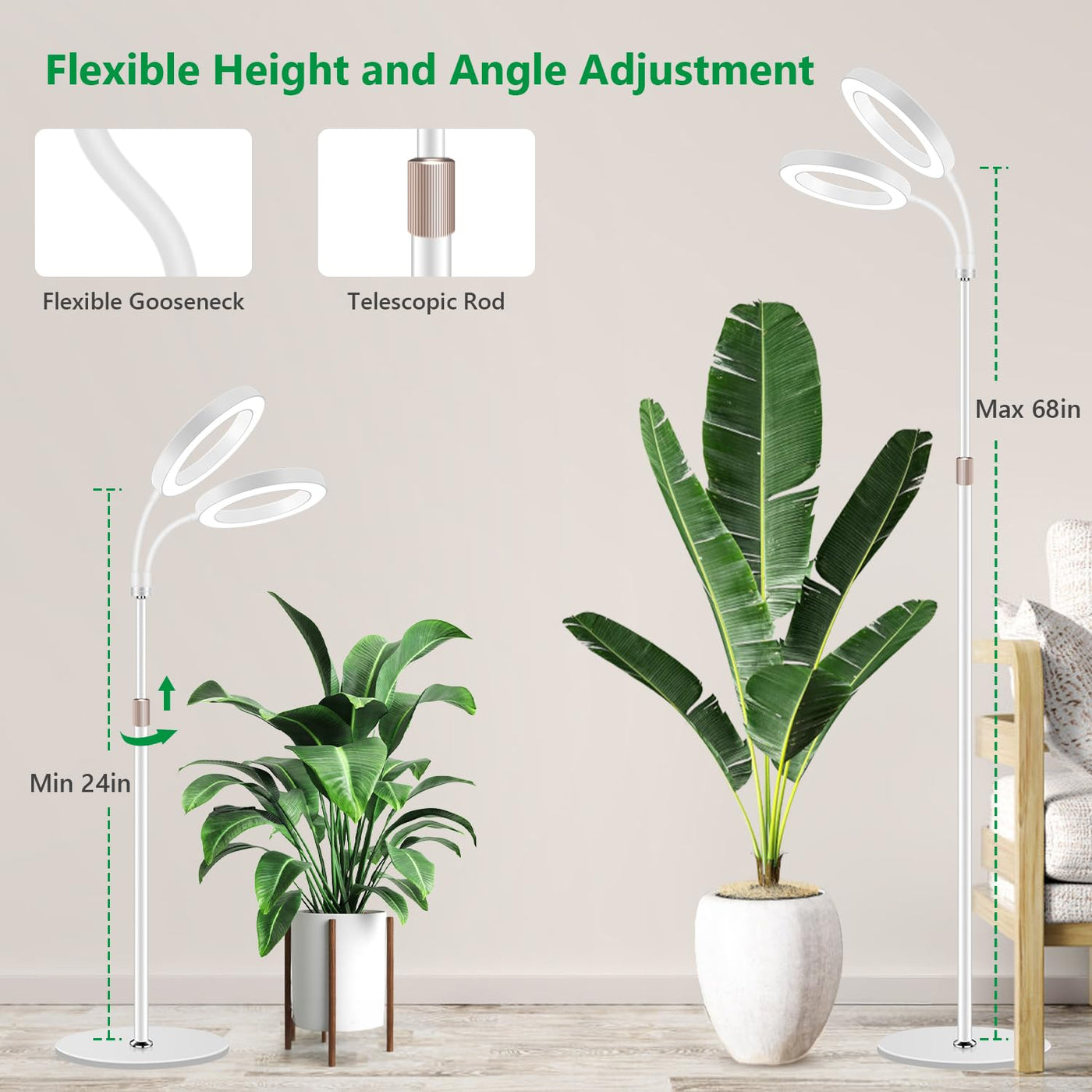 Q: How does the adjustable stand work for different plant heights?A: The adjustable stand of the Aumtrly Large Plant Light can extend up to 68 inches, allowing you to position the light at the optimal height for large or tall plants. The dual head design and flexible gooseneck enable you to direct light precisely where it's needed.