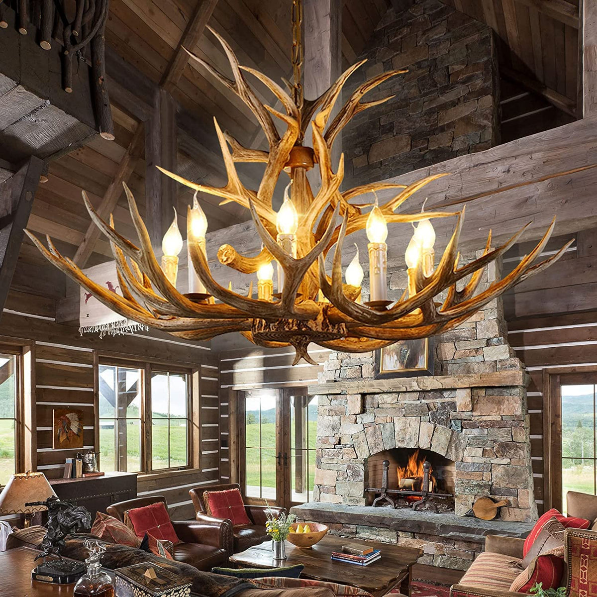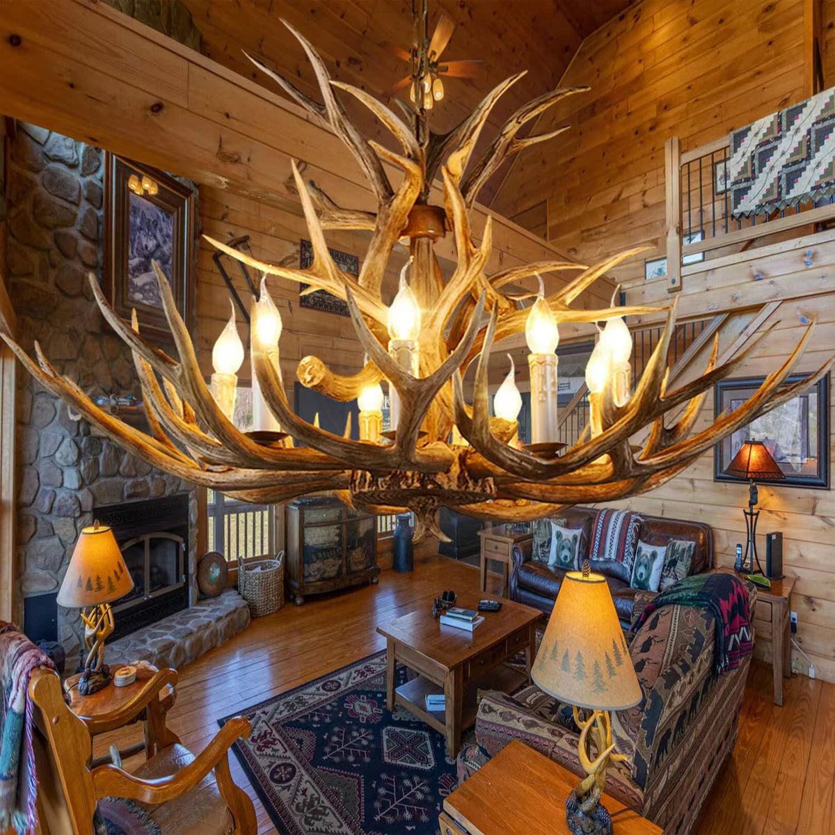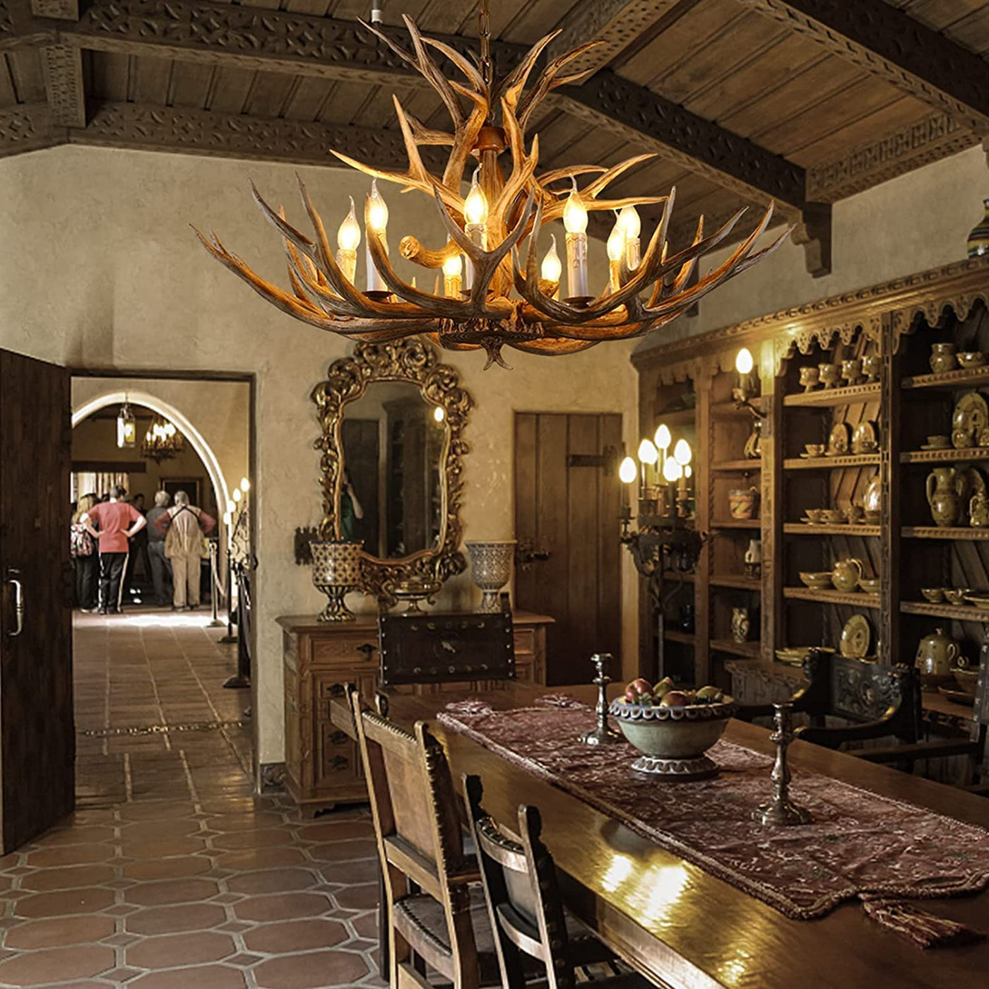 Artificial Rustic Resin Deer Horn Pendant Light In myth, the deer is the god of the forest, the guardian god of spirits and animals. The deer symbolic good expectations, hope our antler lights will bring you good expectations. Each antler is hand-dyed and antiqued. We have tried many reverse molding techniques to achieve precise comparability with real antlers. With excellent resin lamp body and natural high-strength resin material, our ceiling lamp becomes durable and beautiful. Antler Chandelier Lighting Make your house stand out! By placing the chandelier in the location of your choice, you can create beautiful decorative lights for living rooms, bars, restaurants, cafes, etc. The texture is higher, the old-fashioned ceiling lamp will never be out of date. Specification Material: Resin Color: Brown Voltage: 110-240 V Switch: Not Included Bulb:E12 bulb base Size: 6 lights:L:66cm/26in; W:43cm/17in; H:31cm/12in 9 lights:L:56cm/22in; W:43cm/17in; H:56cm/22in Hanging chain: 90cm /35.3in (Adjustable) Application scenario: Parlor, Bar, Restaurant, Bedroom, home lighting, Other Deer Antler Chandelier Light Holder Chandelier Adopt E12 spiral lamp holder. the antler ceiling light can be used for energy saving lamps, incandescent lamps, LED bulbs, etc. Christmas is coming soon, it might be a good idea to decorate your living room with Deer Antler Chandelier
