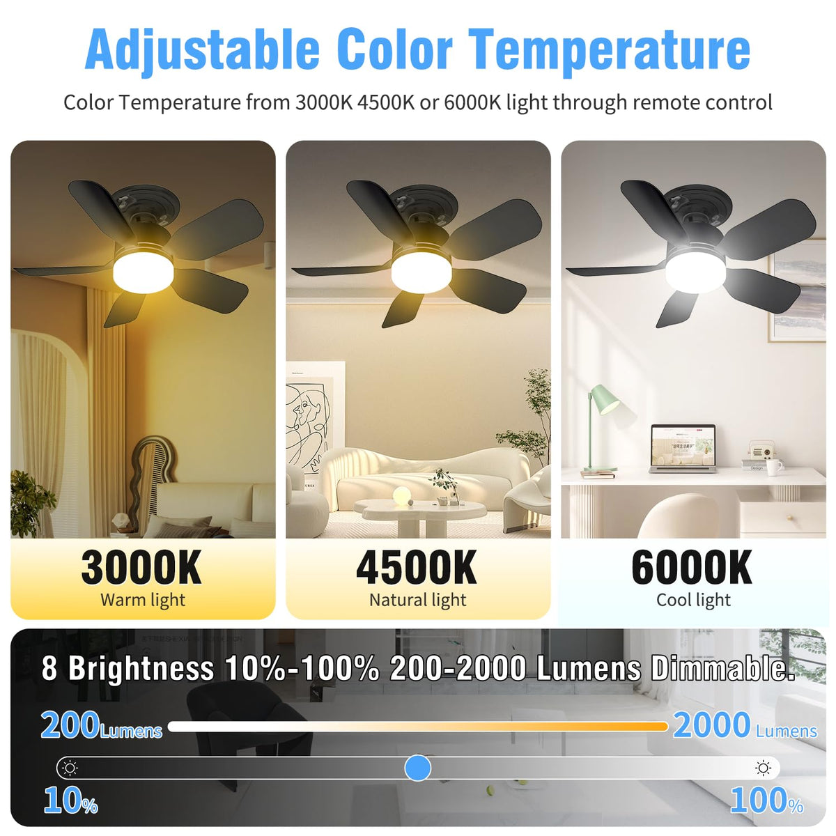 Aupuslite 20 '' Socket Fan Light With Remote, 30W Socket Ceiling Fan 2000 Lumens, 3 Colors Light 3000-6000K 6 Speed Wind Setting