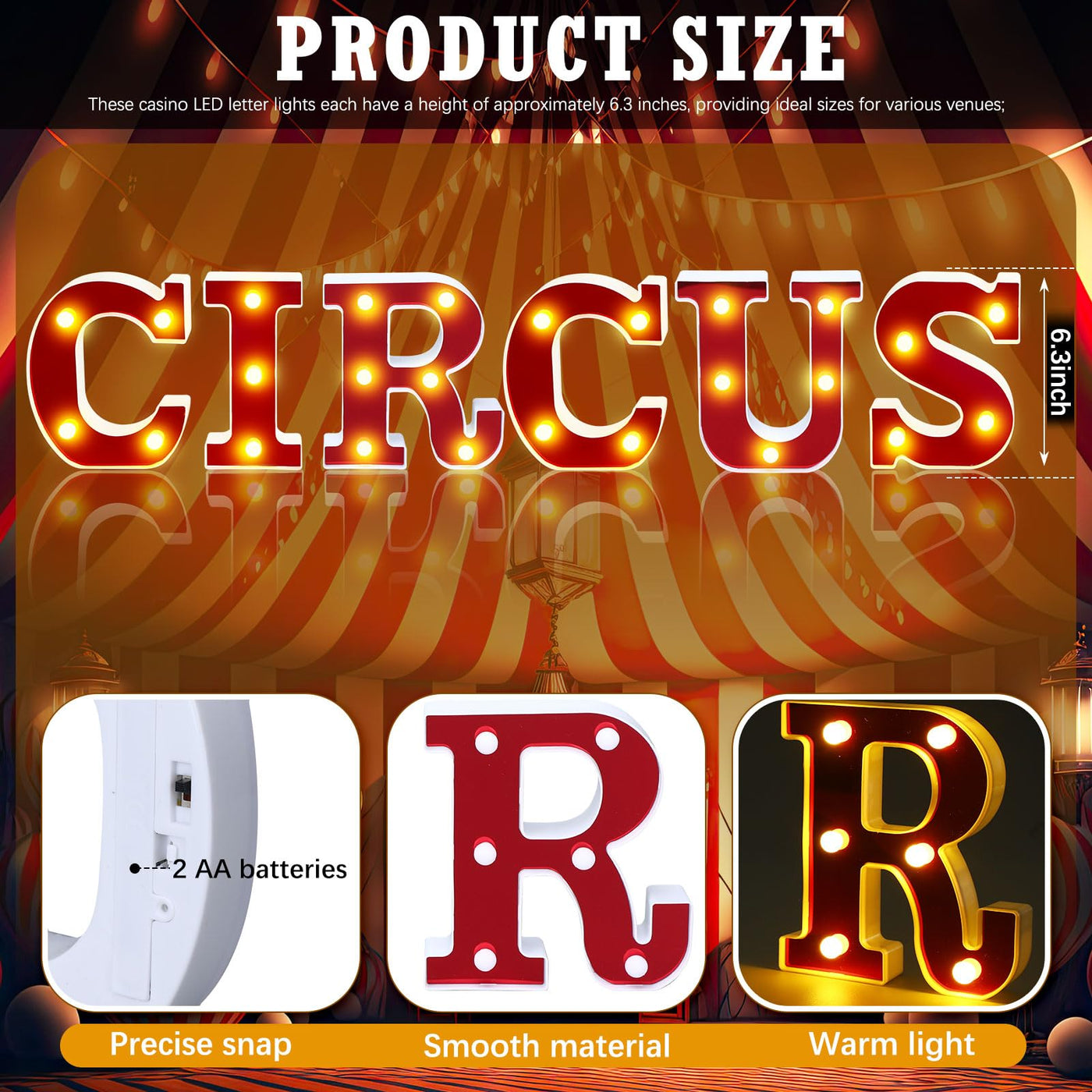 Crafted from well-made mirror materials, the circus light signs are not only durable but also aesthetically pleasing, ensuring they are long-lasting additions to your event accessories. This kit includes a complete set of lighted letters that spell out inCIRCUS,in making it easy to set a vibrant mood for your celebrations. Each letter features a bold red design that stands out beautifully in any setting, complemented by warm light that adds a charming glow.