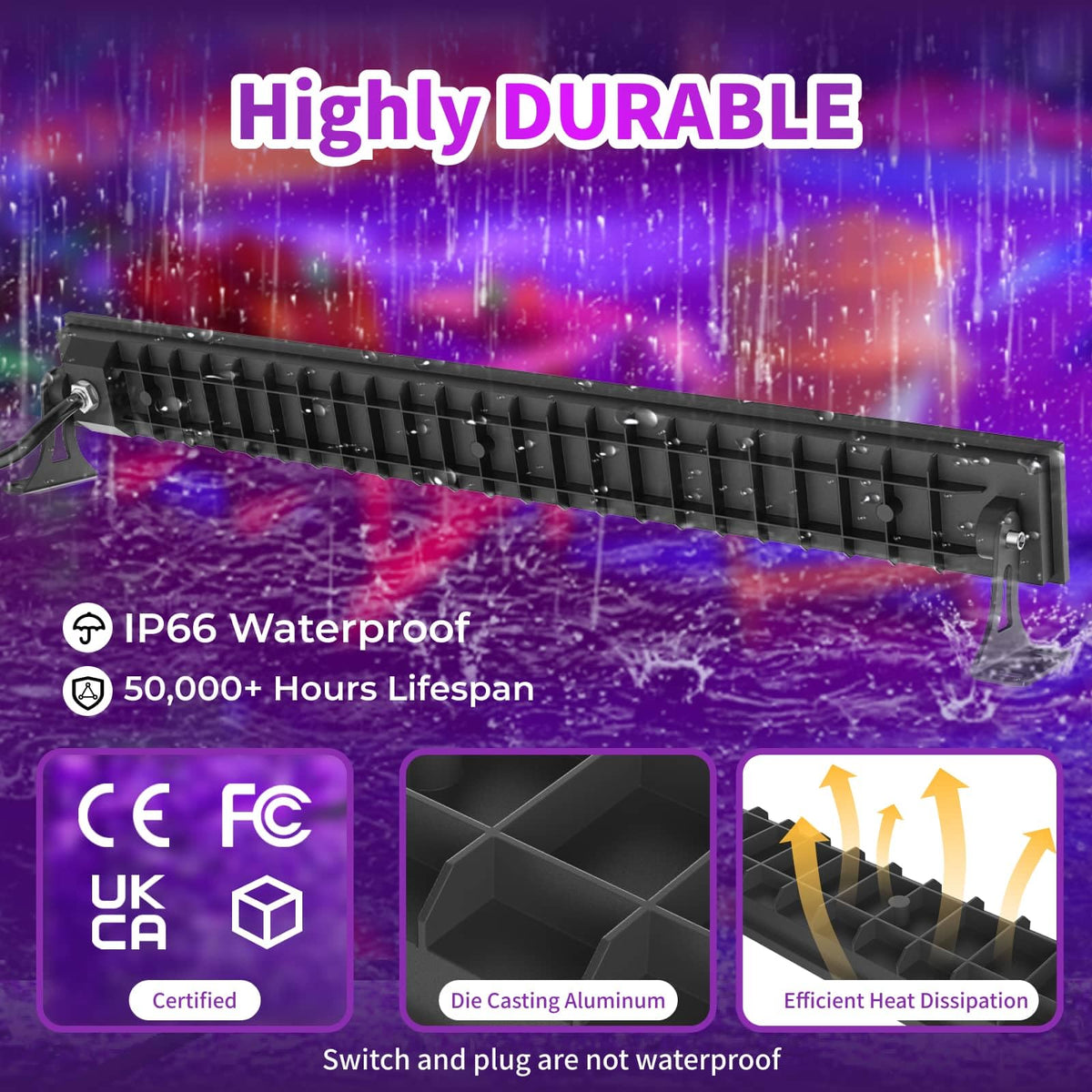This black light bar features top-grade LED technology, providing a long-lasting service life of up to 50,000 hours. It emits UV light within the 385-400nm range, specifically optimized for enhancing fluorescent materials while minimizing regular light interference. The unit is designed with a robust die-cast aluminum body that guarantees durability and IP66 waterproof capabilities, making it suitable for both indoor and outdoor use.