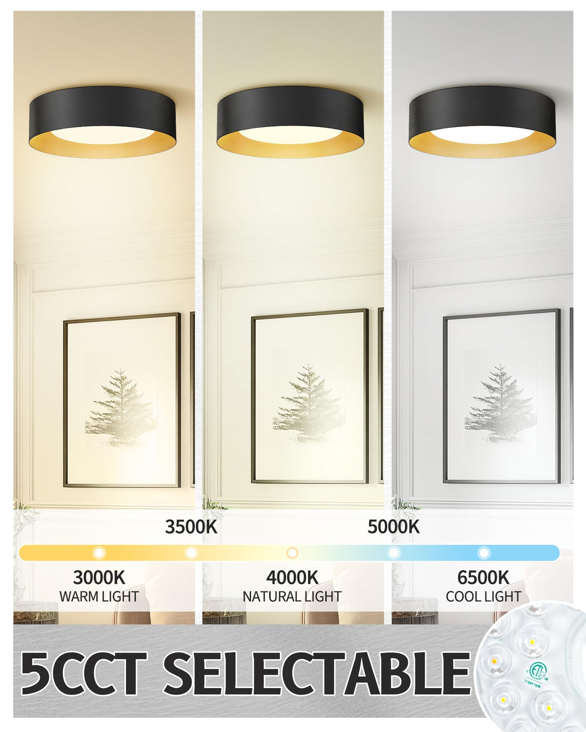 Q: What are the color temperature options for the AUTELO 16" Ceiling Light?A: The AUTELO 16" Ceiling Light offers five color temperature options: 3000K, 3500K, 4000K, 5000K, and 6500K, allowing you to choose the perfect ambiance for your space.