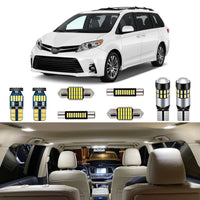 Specifications: Compatible Make/Model: Toyota Sienna Year Range: 2011, 2012, 2013, 2014, 2015, 2016, 2017, 2018, 2019, 2020, 2021 Includes: Map Lights, Dome Lights, Vanity Mirror Lights, Door Lights, Trunk/Cargo Lights, and License Plate Lights (15 piece LED light bulbs total). Voltage: 12V DC Color Temperature: 6000K Xenon White Bulb Lifespan: 40,000hrs Fitment Type: Direct Replacement