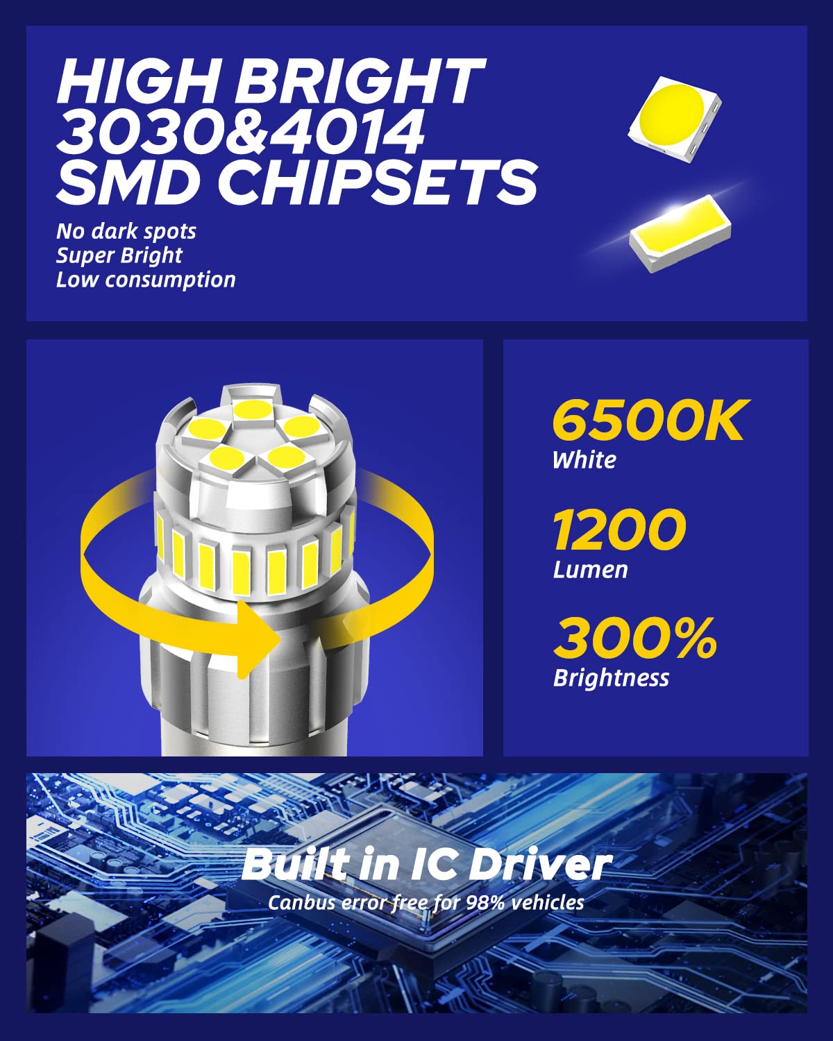 Q: How bright are the AUTOONE 1156 LED Bulbs compared to halogen bulbs?A: The AUTOONE 1156 LED Bulbs are designed to be 300% brighter than standard halogen bulbs. They utilize high-quality 3030SMD LED chips for enhanced visibility, ensuring safer reversing and driving in low-light conditions.