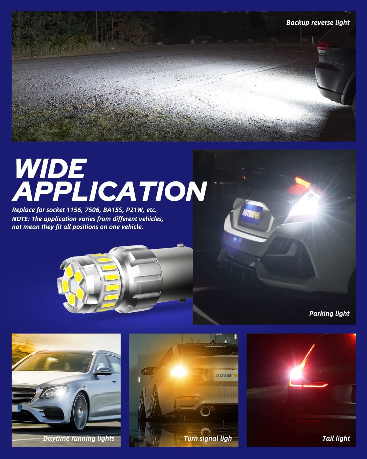 Q: What vehicles are compatible with the AUTOONE 1156 LED Bulb?A: The AUTOONE 1156 LED Bulb is compatible with most vehicles that use BA15S, 7506, 1003, 1141, and P21W bulb sizes. However, it's important to check your vehicle's owner's manual or the original bulb to confirm the correct light size before purchasing.