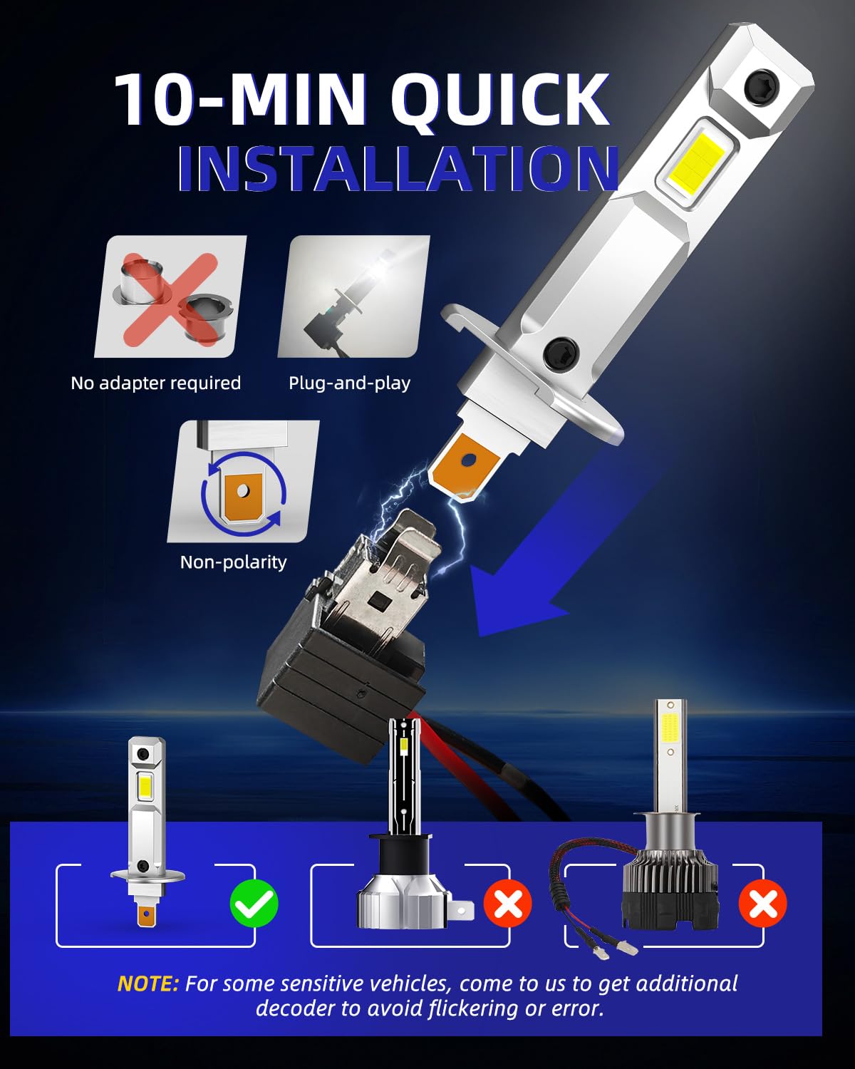 Q: Are AUTOONE H1 Fog Bulbs compatible with my vehicle?A: AUTOONE H1 Fog Bulbs are designed to be compatible with 99% of vehicles' systems thanks to their built-in intelligent IC driver. However, for some sensitive models, an additional decoder or anti-flicker harness may be necessary. It's best to consult your vehicle's user manual to confirm compatibility.