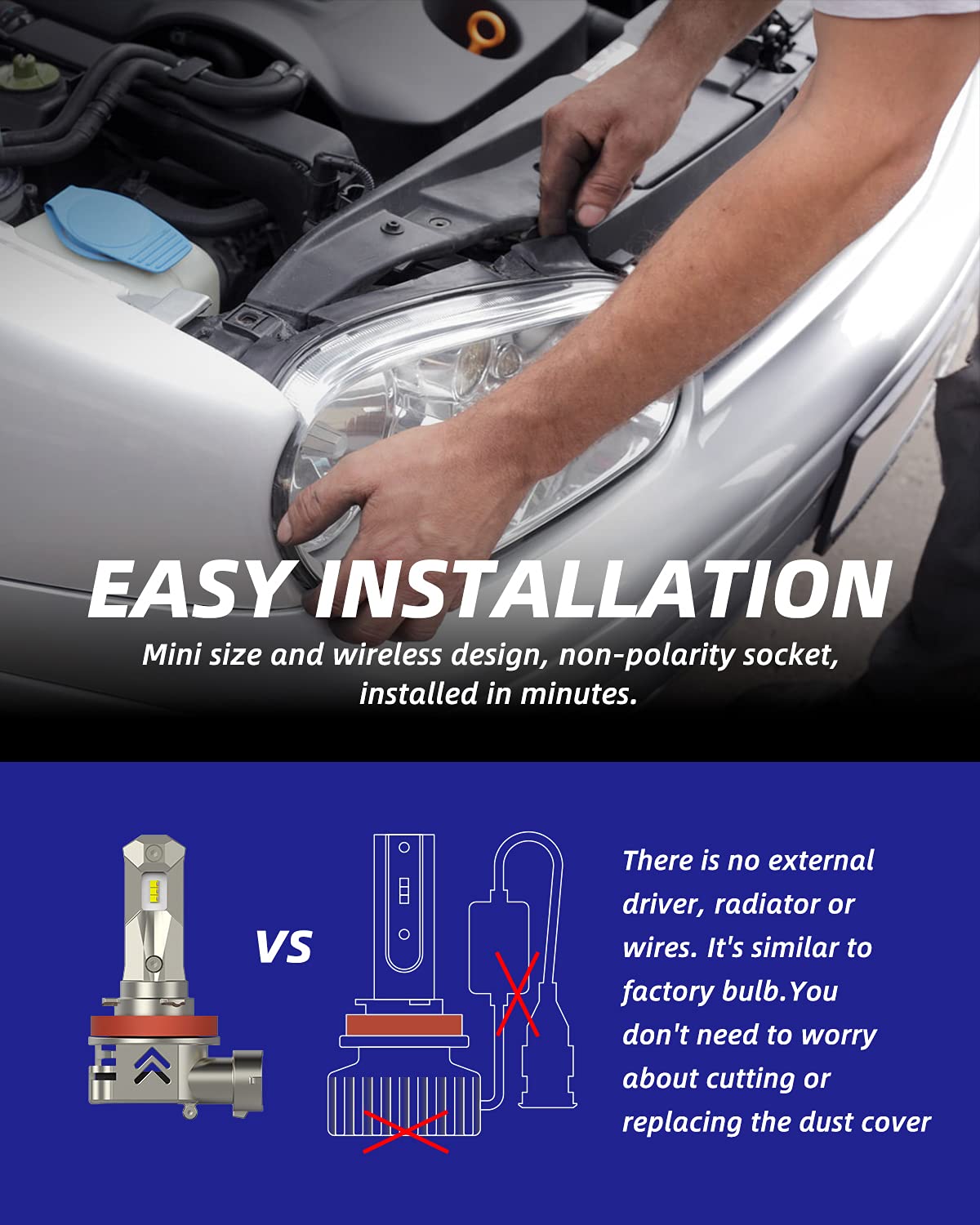 Q: Are these fog lights easy to install?A: Yes, the AUTOONE H11 LED fog bulbs feature a plug-and-play design that allows for hassle-free installation without the need for external drivers or wire harnesses, making it easy to upgrade your vehicle's lighting.