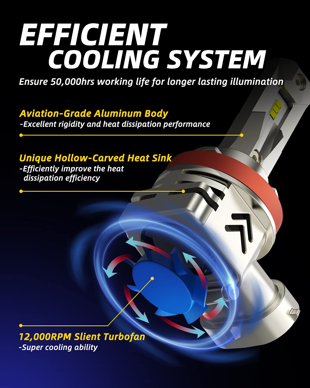 Q: What is the lifespan of the AUTOONE H11 fog lights?A: These fog lights are built with a 12,000 RPM high-speed cooling fan that ensures continuous lighting for more than 50,000 hours, providing a long-lasting and reliable lighting solution.