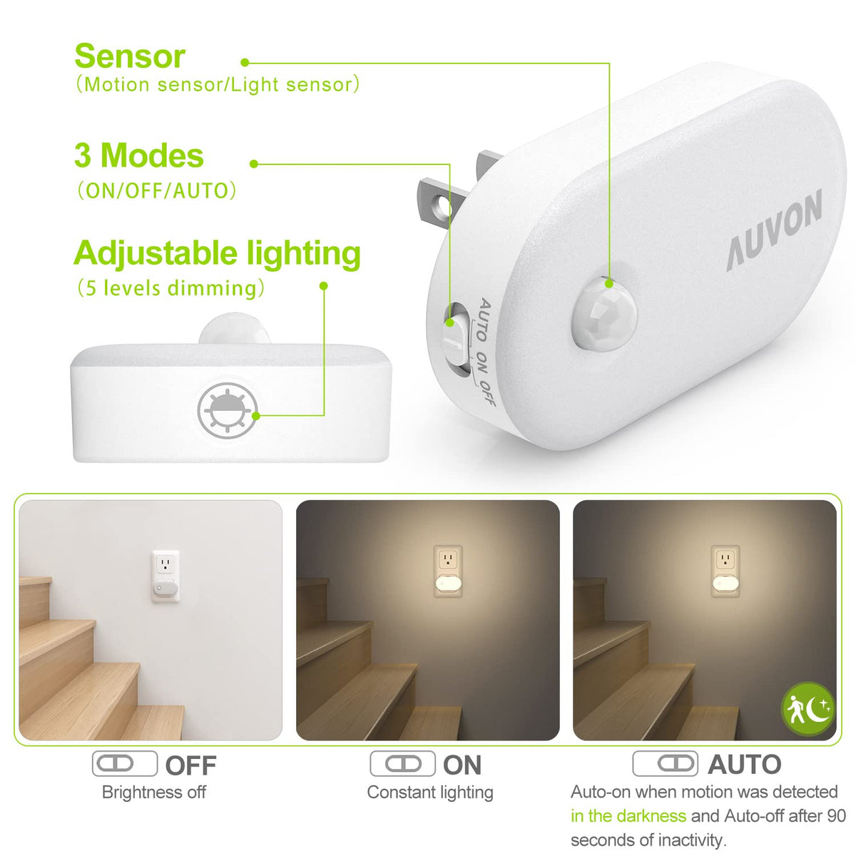High Luminance Motion Sensor with on-off-auto Modes In auto mode, this bright night light will automatically turn on when motion is sensed in the dark, up to 13 feet away, including a 120 degree detection zone and will shut off after 90 seconds of no activity. Dimmable The AUVON plug in night light comes with a 5-fixed dimming and 5-stepless dimming function, you can adjust the luminance from 1-5 gear in sequence with a short tap, and with a long press, you can change the light to your desired luminance(1-120LM).