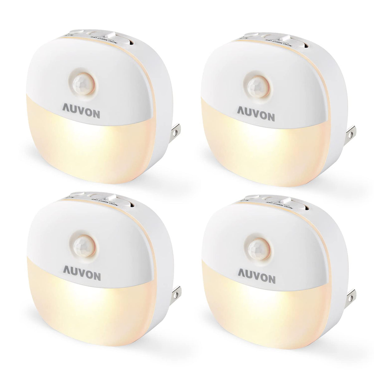 Q: What comes in the package when I purchase the AUVON night light?A: When you purchase the AUVON Plug-in Night Light, you will receive a pack of 4 night lights, a user manual, a 24-month warranty, and technical support to assist you with any issues or questions.