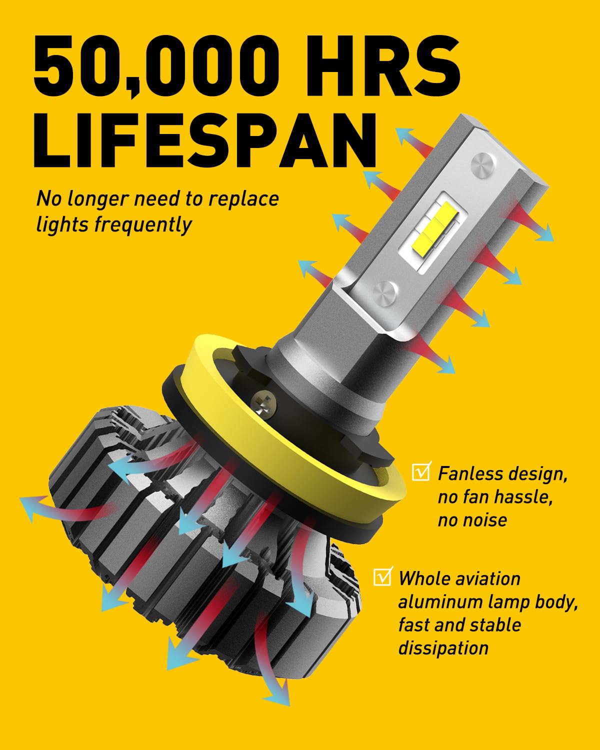 Q: What is the lifespan of AUXITO H11 LED bulbs?A: These LED bulbs have a lifespan of over 30,000 hours, thanks to their fanless design which ensures efficient heat dissipation, even in extreme temperatures.
