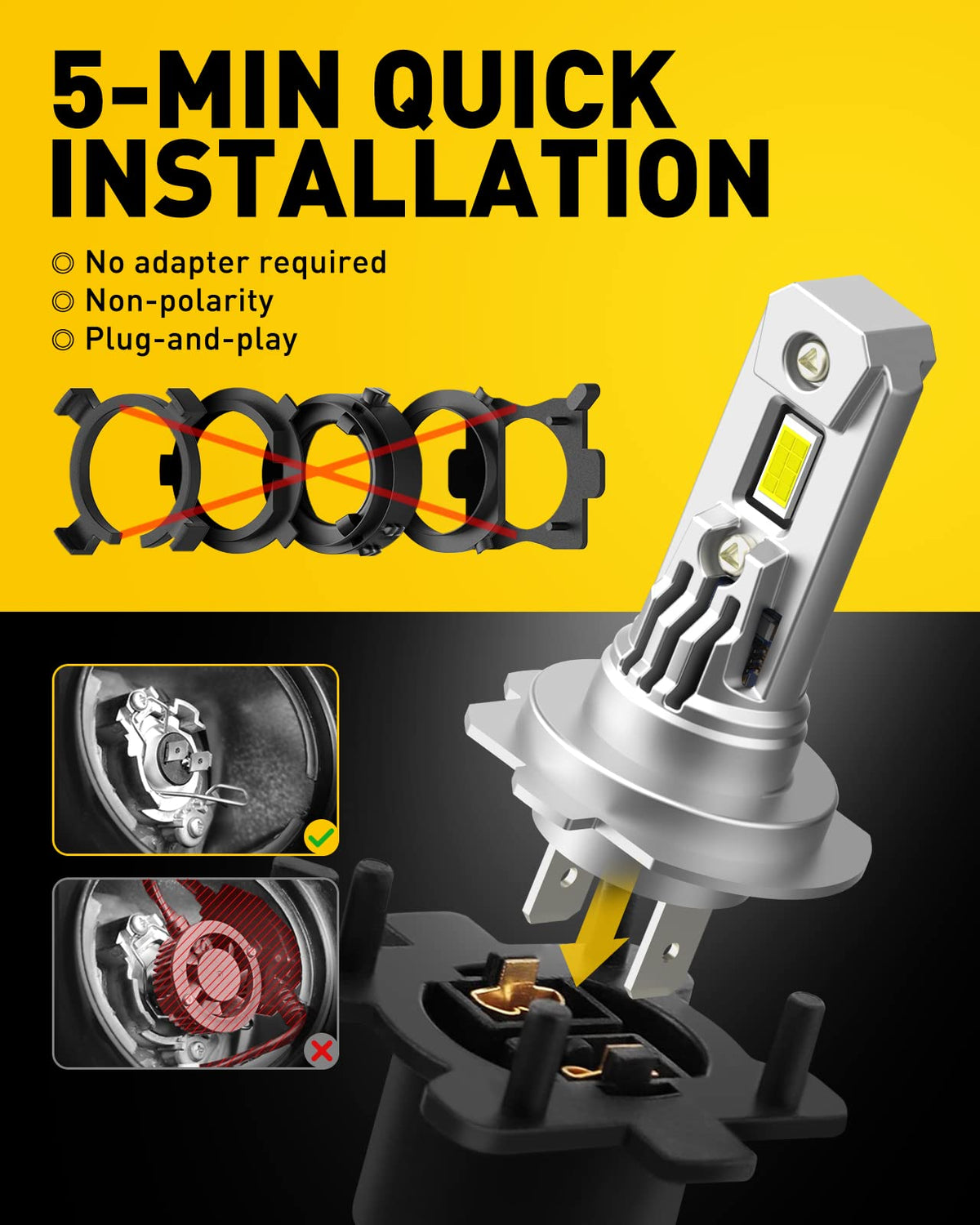 Now AUXITO 2023 version H7 light bulbs have addressed all the concerns you may have. Not only built-in silent fan to achieve three times brighter than halogen lamp, but also 1:1 design with halogen lamp, no need for specific adapters