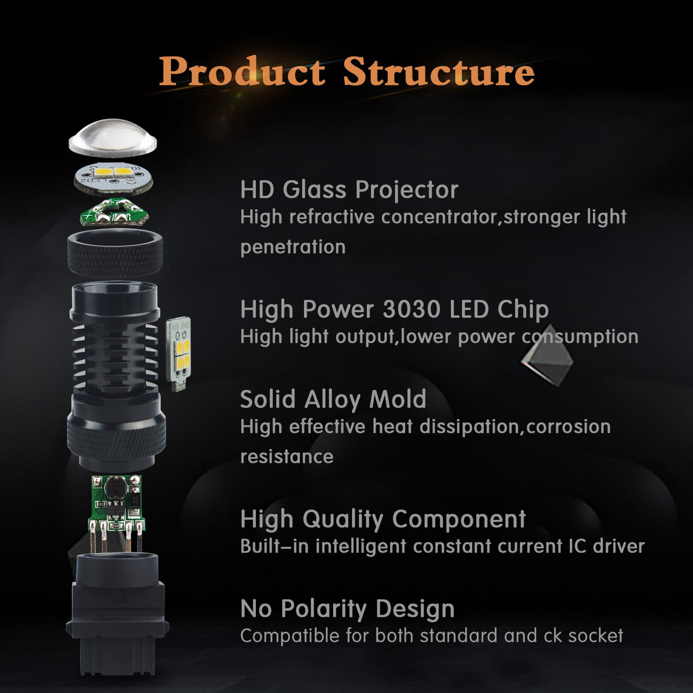 Each bulb powered by 14 pcs high power 3030 led chips, low power consumption but high light output. HD glass lens for stronger light penetration | DC 9V to 18V wide-range voltage design, built-in constant intelligent IC driver, no digital and VHF radio signal interference. Aluminum circuit board, high effective heat dissipation | 6000k xenon white,1200 lumens each bulb. Can be used for backup reverse lights, turn signal lights, tail lights, brake light etc, NOT for daytime running lights | Plug and play easy installation, no polarity design, compatible for both standard and ck socket.Fit socket 3156 3056 3356 3456 4156 3157 3047 3057 3357 3457 4057 4111 4114 4157 etc.The 50w 6ohm load resistor or flasher relay may needed to prevent the hyper flash or the bulb does not blink for vehicles with built-in canbus system | Amazon filter system may not be 100% accurate, the bulb size may vary between trim of your vehicle.Please double check owners manual or original bulb size to confirm before placing an order