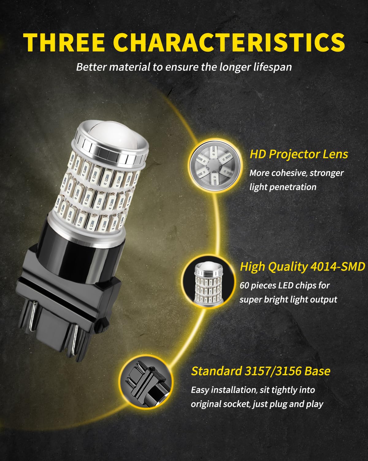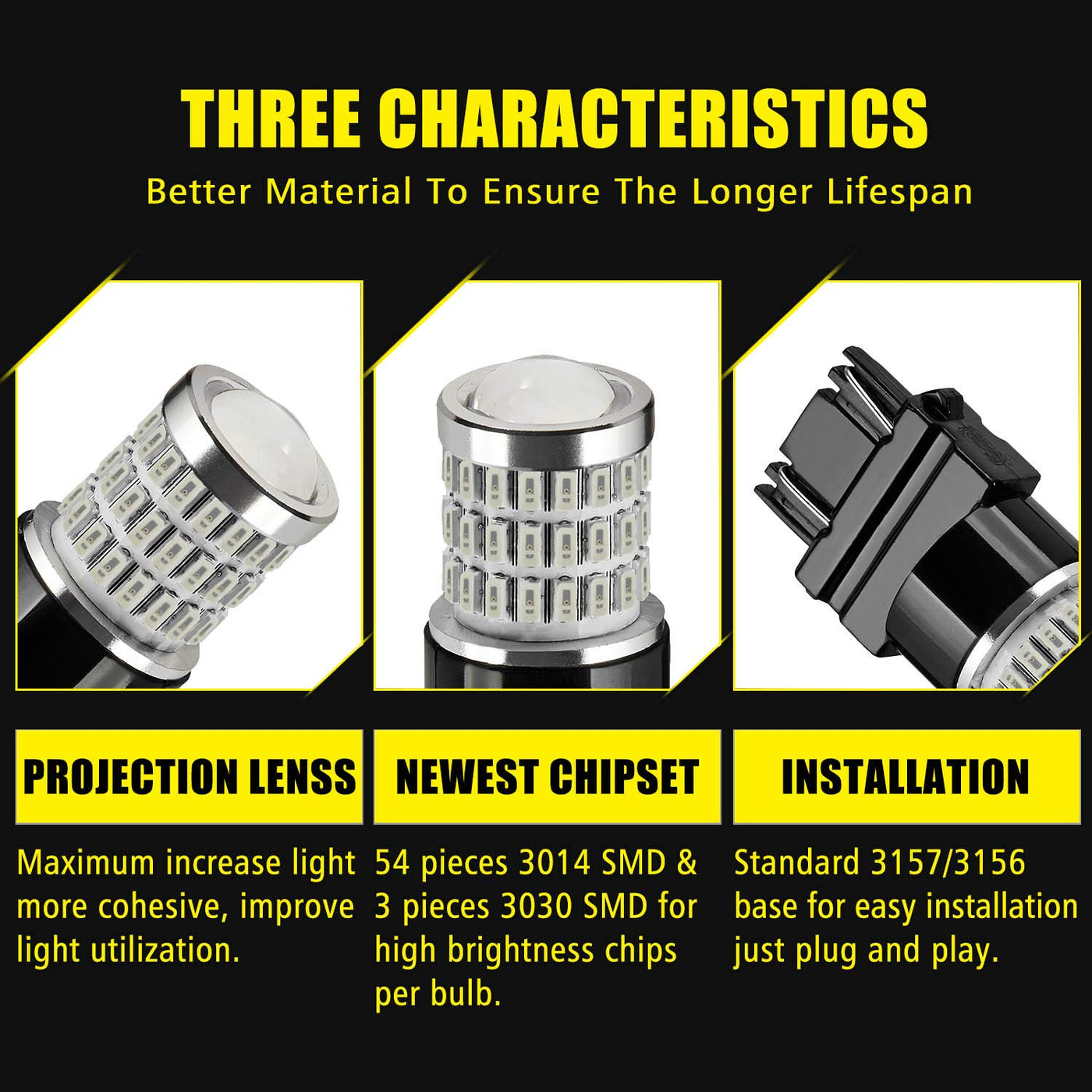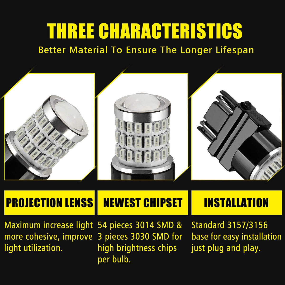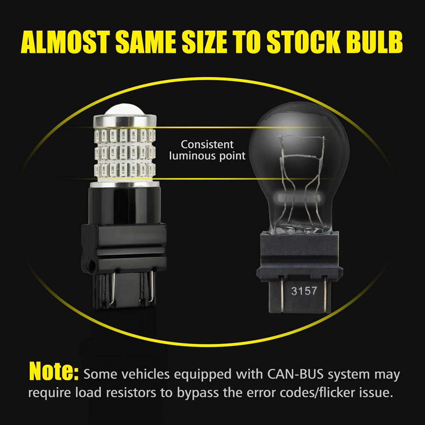 Q: Are these LED bulbs compatible with my vehicle?A: These bulbs fit a wide range of sockets including 3157, 3156, 3057, and many others. However, it's essential to check your vehicle's owner's manual or the original bulb to confirm compatibility before purchasing.
