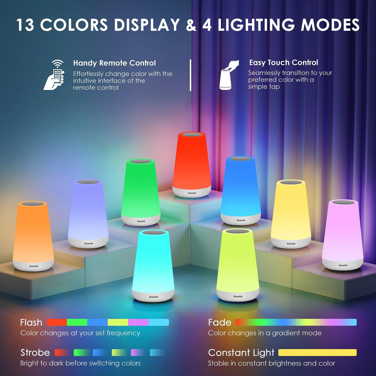 Auxmir Night Light, Dimmable Touch Lamp For Bedroom, Portable Rechargeable Bedside Table Lamp For Baby Nursery, 13 Rgb Colors &