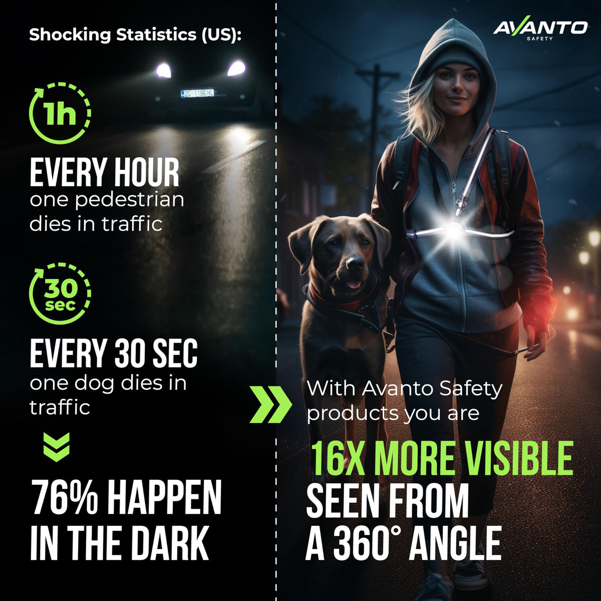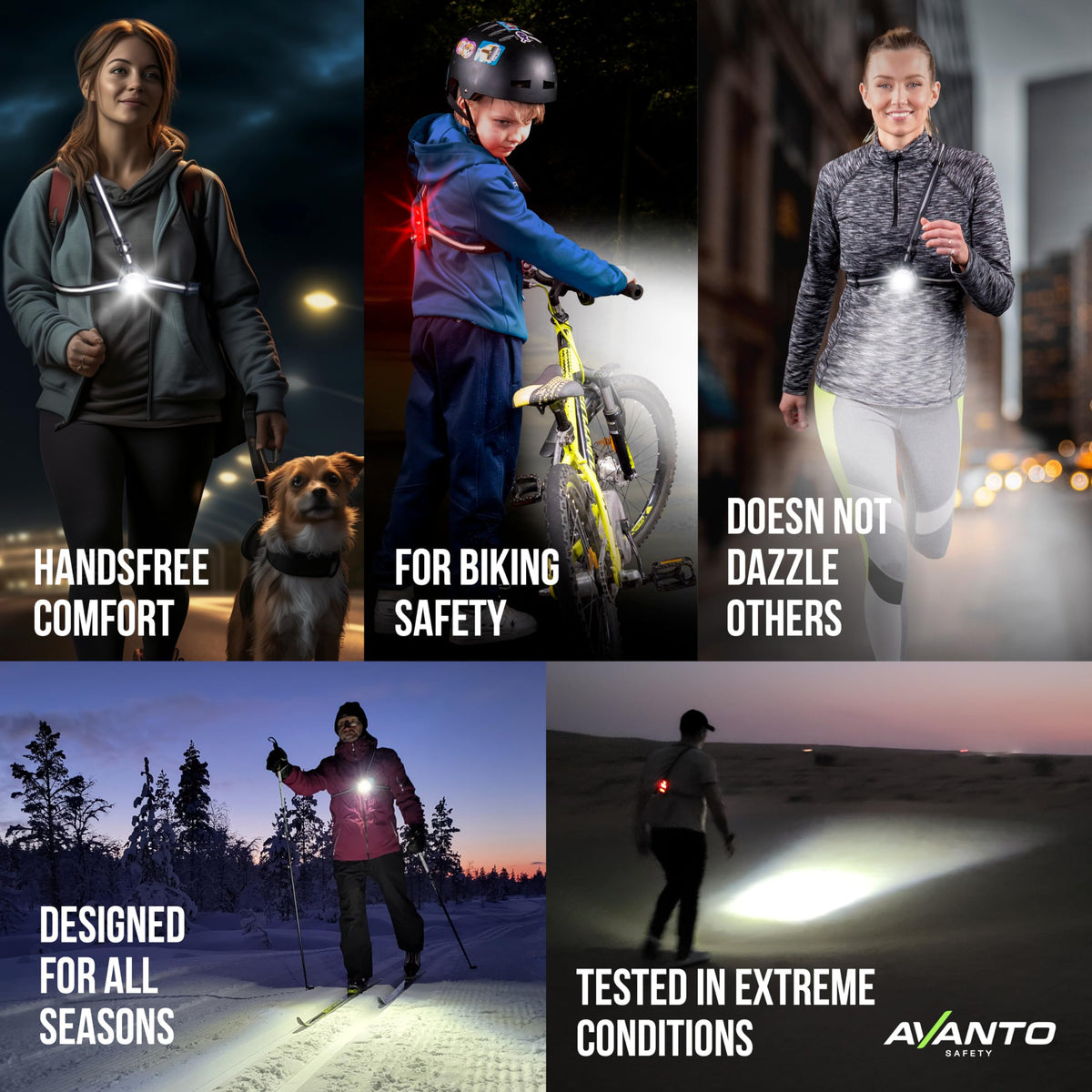 Introducing the original AVANTO light, a versatile companion designed to elevate your nighttime running experience. Our waist lights for runners provide exceptional brightness in a compact and lightweight design. Say goodbye to bulky headlamps and embrace the freedom of hands-free running. With our rechargeable running lights, you can go the distance with confidence. Equipped with a powerful running flashlight, youll never miss a step even in the darkest conditions. Our night light for walking ensures your safety during nighttime strolls, providing reliable illumination for enhanced visibility. Designed for comfort and convenience, our hands-free flashlight is perfect for night walking or any low-light activity. Experience the best running lights for runners with our LED options. Engineered to deliver superior performance, these lights offer optimal brightness and clarity. Whether youre running at night or engaging in outdoor activities, our running lights provide the visibility you need. Stay safe and focused with the best running lights available. Our chest light for running at night is a game-changer. With its wearable design, it offers targeted lighting that illuminates your path without obstructing your movements. Designed for both style and functionality, our chest light ensures you stand out while providing ample illumination. Leave traditional headlamps behind and embrace the convenience and comfort of our body flashlight. Be prepared for any adventure with our jogging lights. Trust in our outdoor night running lights to guide your way, keep you safe during your nighttime runs. Push your limits and challenge your comfort zone with confidence. At AVANTO, we are passionate about supporting your active lifestyle. Our range of products, including reflective vests, clip-on lights, and LED chest lights, is designed to enhance your safety and visibility during nighttime activities. Join our community of adventurers and elevate your night runs with AVANTO.