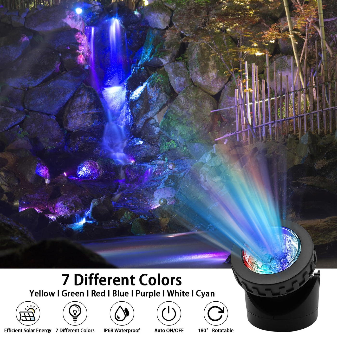 - **Versatile RGB Lighting**: Experience dazzling illumination with 7 vibrant colors (Red, Yellow, Blue, Green, Cyan, White, Purple) and 2 dynamic modes (Color changing mode and Red flashing mode), perfect for elevating your outdoor ambiance.