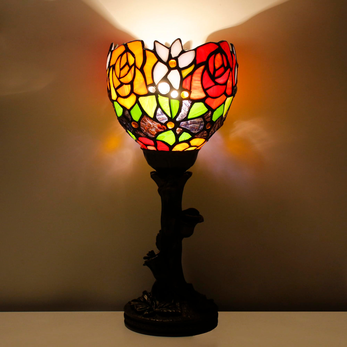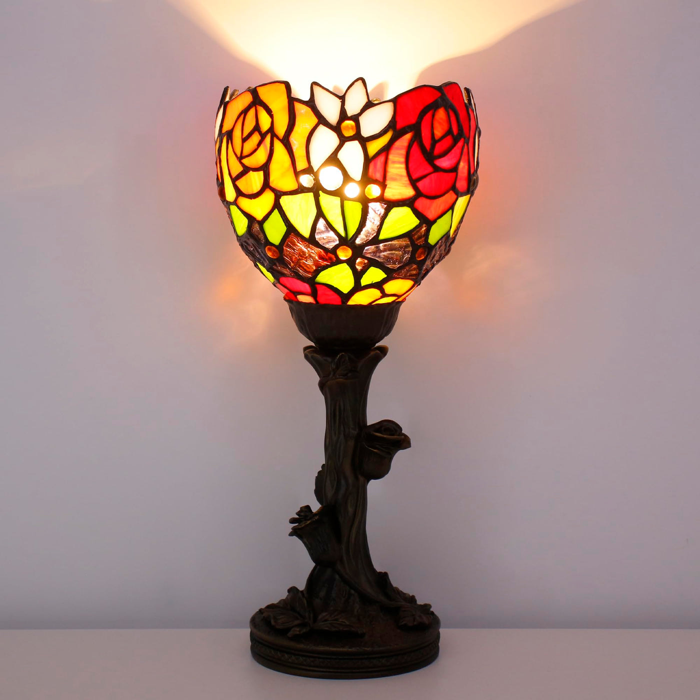 Avivadirect Small Tiffany Lamp Mini Stained Glass Table Lamp Red Rose Accent Desk Uplight W6H 13.5 Inch Bronze Resin Base