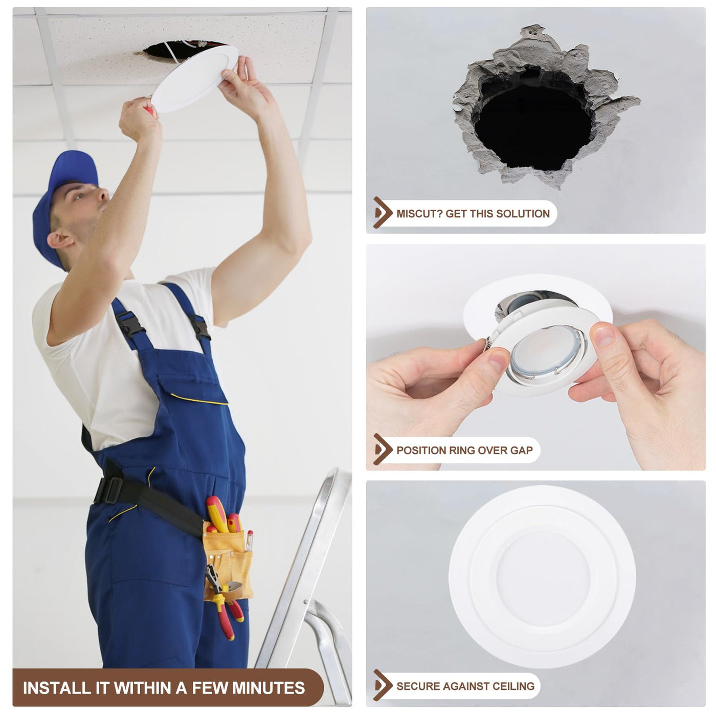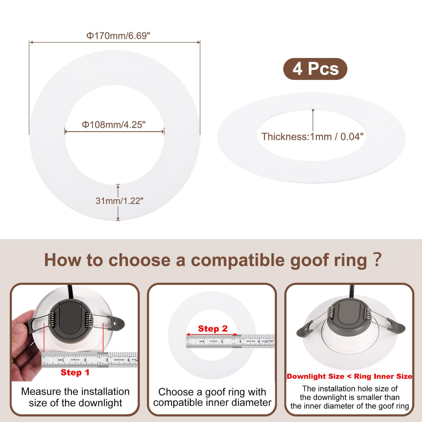 Our Trim Ring Is Specifically Designed To Conceal Mounting Hole Gaps In Downlights And Spotlights, Acting As A Replenish Ring For Lamp Holes. It Provides The Same Effect As Adding Spacers To Led Lights, Resulting In A Seamless Appearance On Your Ceiling.The White Metal Trim Rings Are Crafted To Cover Any Imperfections Such As Torn Drywall, Damaged Areas, Mis-Cuts, Or Oversized Holes, Effectively Hiding Flaws And Giving Your Ceiling A Clean And Tidy Finish. Specification: Material: Steel Color: White Diameter: 108Mm X 170Mm X 0.8Mm/4.3 Inch X 6.7 Inch X 0.03 Inch (Inner Diameter X Outer Diameter X Thickness) Packing List: 4 X Goof Ring Advantage: With A Thin Thickness Of Only 0.03 Inches, Our Trim Ring Sits Perfectly Flush Against The Ceiling, Fitting Snugly Between The Drywall And Recessed Light. It Is Also Compatible With Ceiling Fans And Pendant Lights, Offering Versatile Application Options. Crafted From Durable Steel Material, It Provides Strength And Longevity For Reliable Use. Installation:&Nbsp; Place The Baffle Into The Trim Ring. The Trim Ring Is Held In Place By The Baffle. Once The Baffle Is Inside The Trim Ring, Position The Baffle Into The Recessed Lighting Housing And Clip It Into Place With Springs. No Additional Tools Are Required For Installation. Note:&Nbsp; Please Check The Mounting Hole Size Of Your Downlight/Spotlight And The Size Of The Ceiling Opening Before Purchasing The Trim Ring To Ensure Proper Fitment And Compatibility.