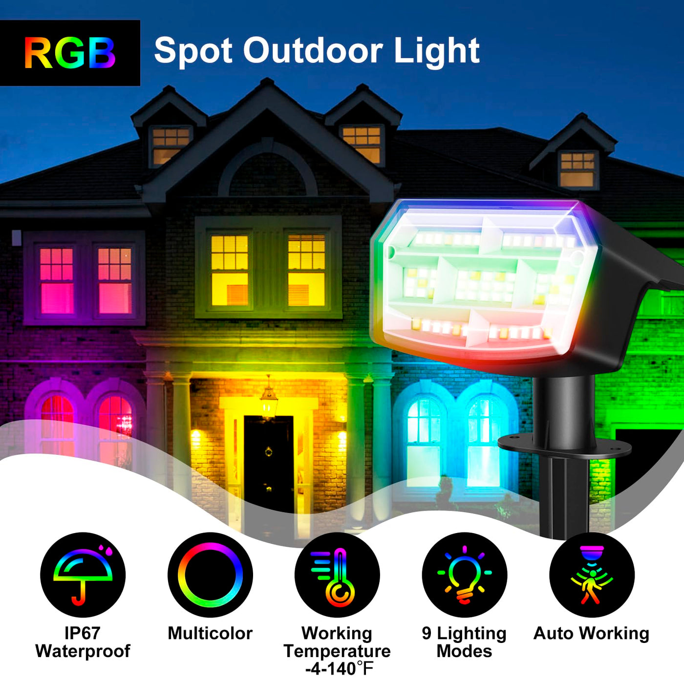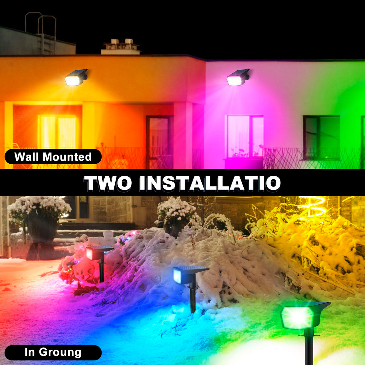 - **Versatile 2-In-1 Installation**: Featuring a specially designed ground stake and wall bracket, these lights can be easily installed as RGB landscape lights or mounted on walls as elegant wall lights. Quick and simple setup allows you to transform any outdoor gathering with colorful LED solar landscape lights.