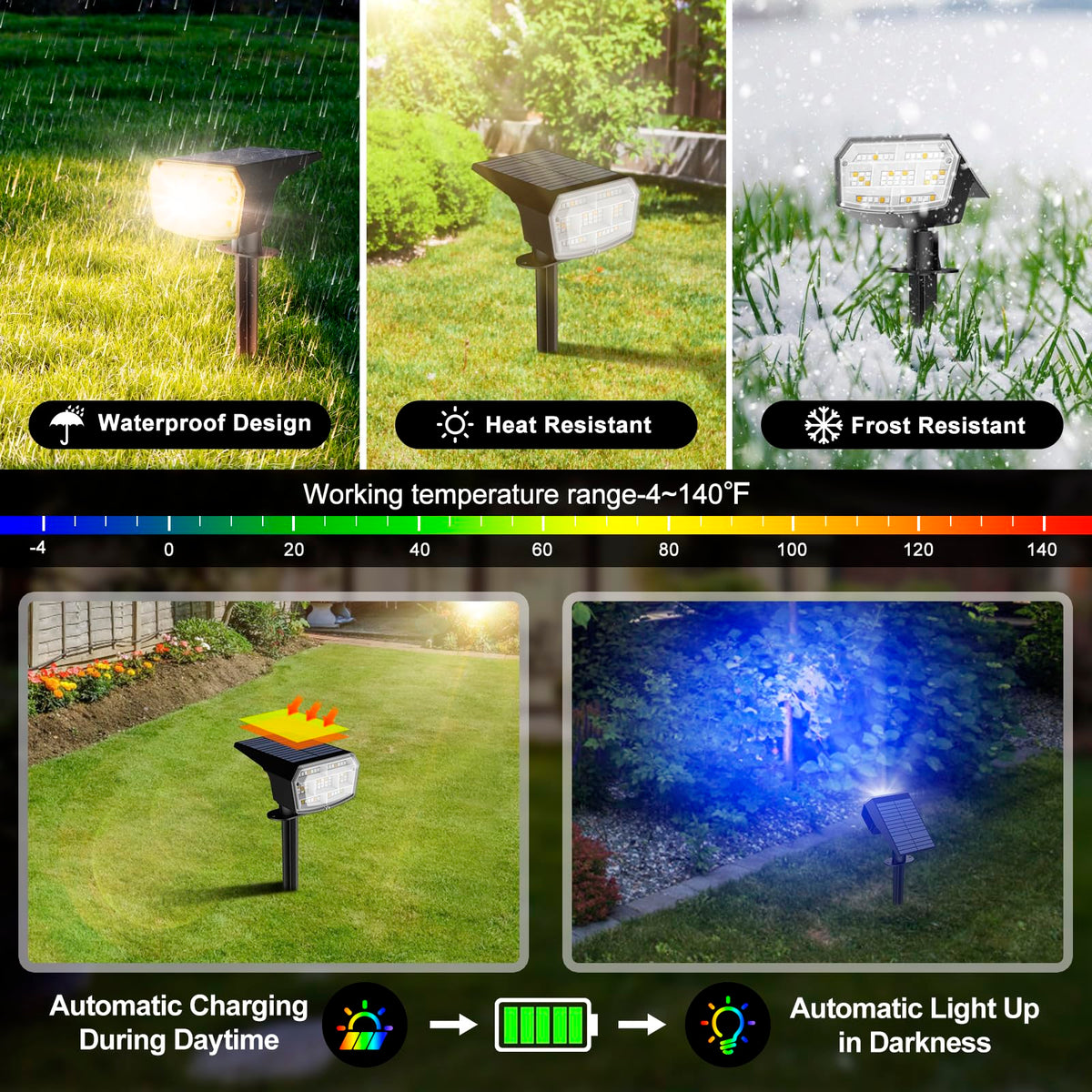 - **Durable & Waterproof Design**: Constructed from ABS high-strength material, these solar spotlights can operate in extreme temperatures ranging from -4? to 140?. With an IP67 waterproof rating, they withstand harsh weather conditions, including rain, snow, and frost, ensuring reliable performance.