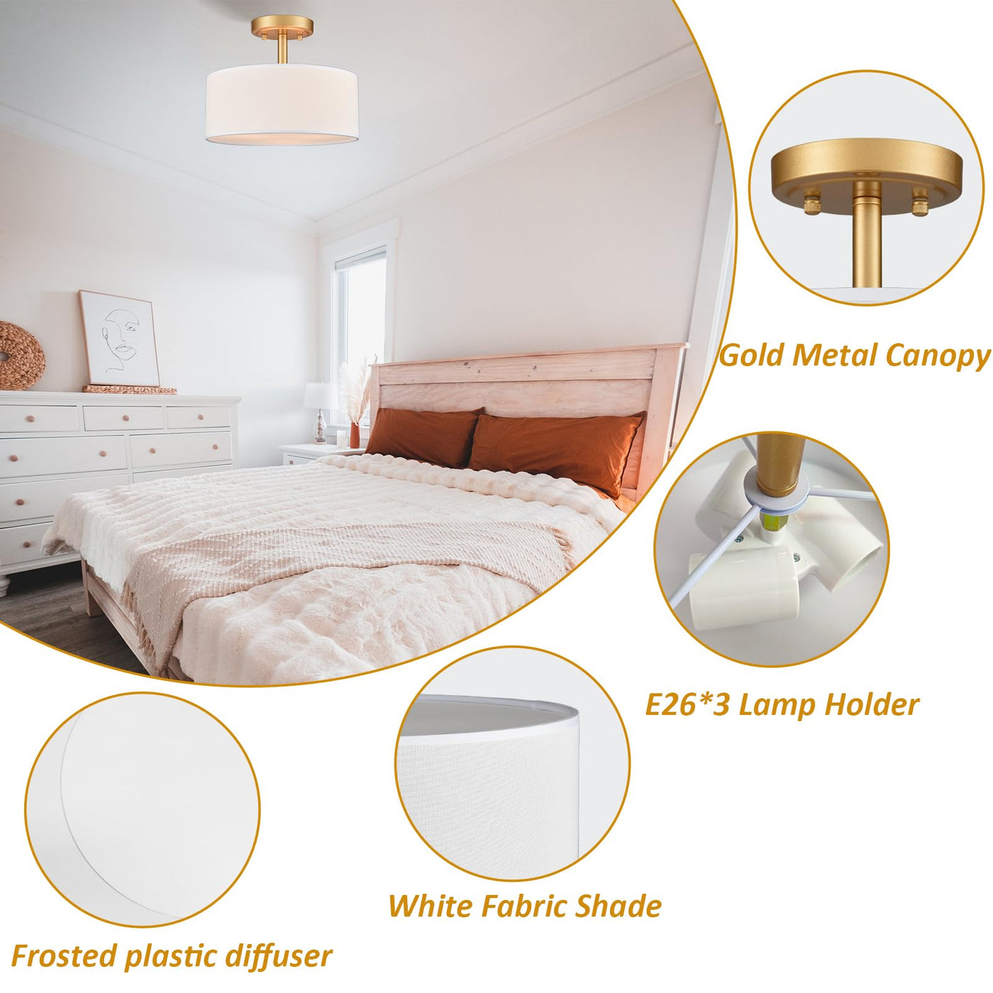 AXILAND Ceiling Light Fixture, Gold Metal, 3-Light Drum Design, Model T7214-3CU-J, Semi Flush Mount for Hallway, Bedroom, Office