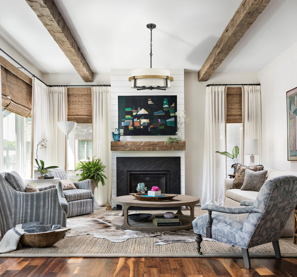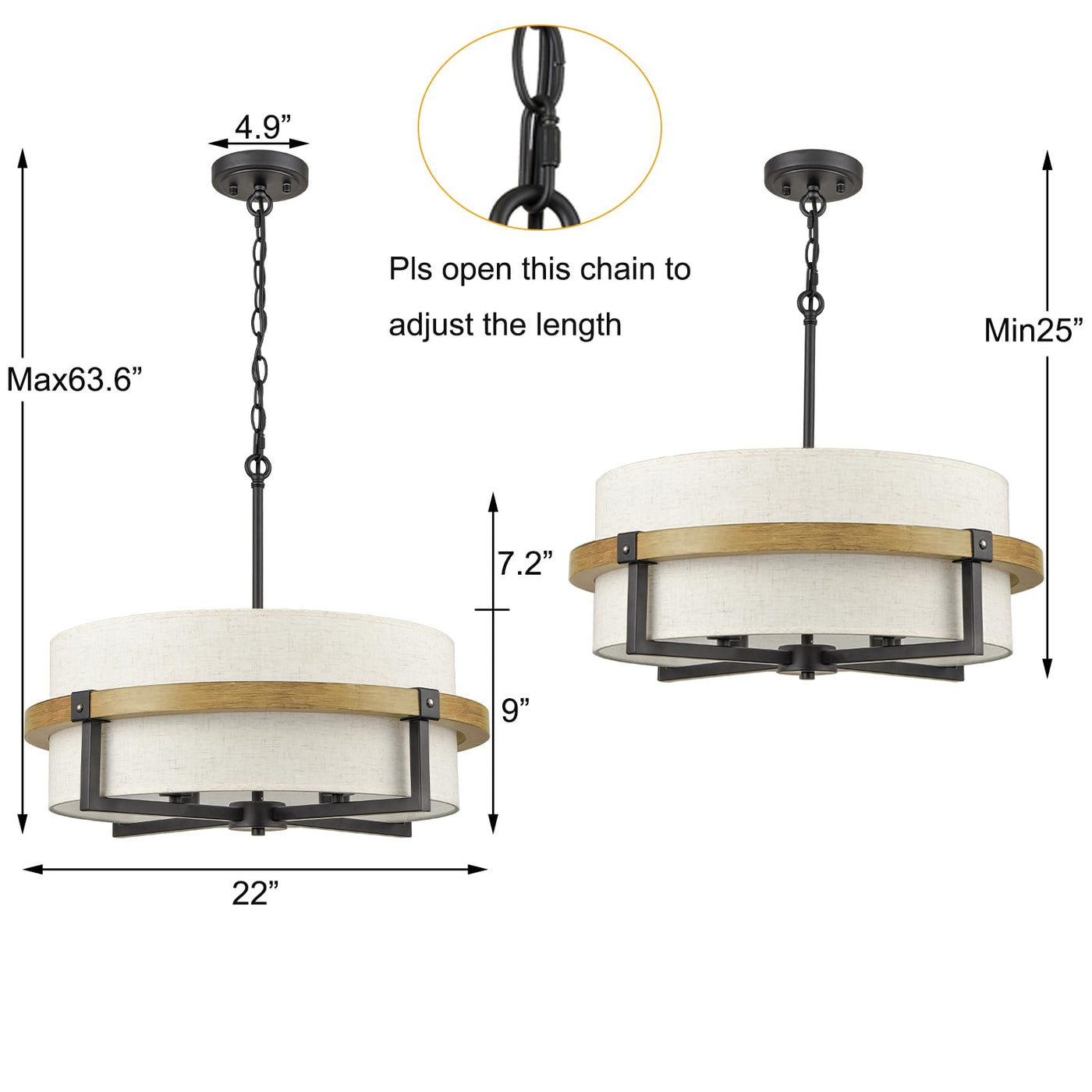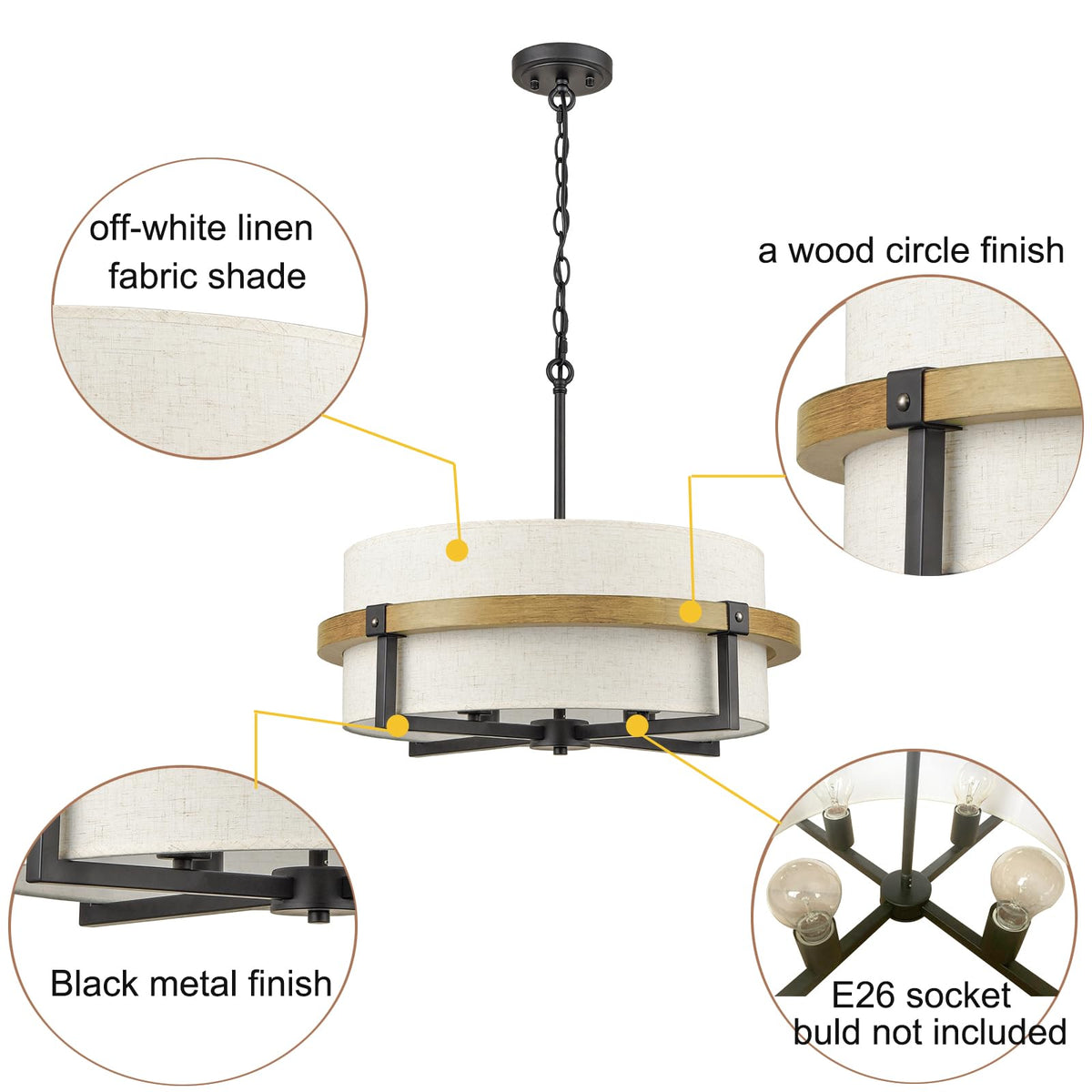 - **Luxurious Linen Fabric Shade**: Designed with a stunning linen fabric drum shade, this chandelier has a rolled edge wood and black metal finish, providing a sophisticated yet warm ambiance.