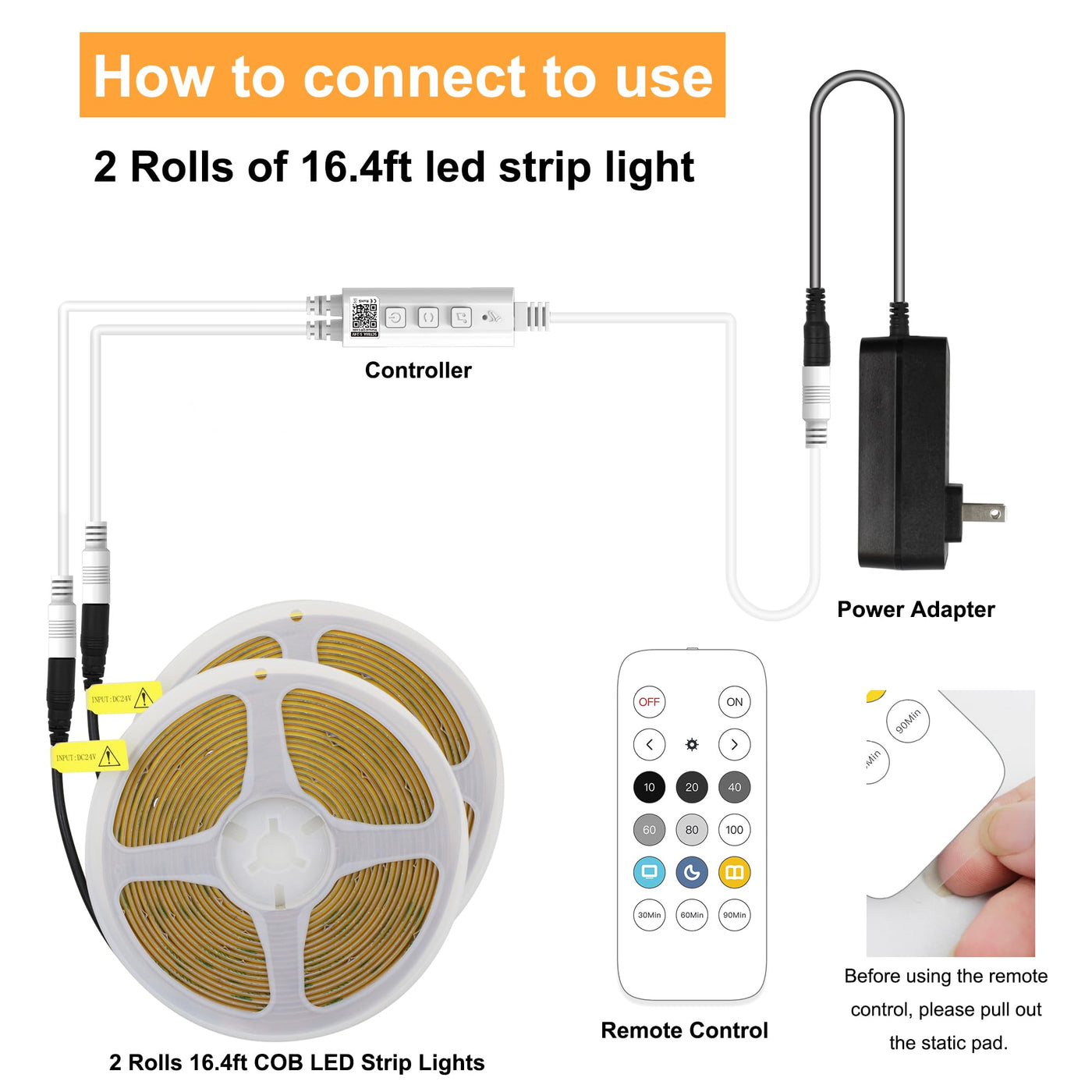 Cob Led Strip Light Technology Is A Step Forward And Best Solution For Led Profile, You Can Customize Your Project, The Leds Are Close To Each Other, And Create Super Even Lighting Performance. Pay Attention To The Surfaces By Double-Side Tape For Led Strip. Such As Glass; Metal; And Plastic Surface That Can Affect Their Function And Durability. Please Test The Adhesion Of The Light Bar Before Installation. Description: 1. Light Source: Cob Led Strip 2. Power: 8W/ Meter 3. Emitting Color: 3000K Warm White 4. Viewing Angle: 180 Degrees 5. 3M Adhesive Tape On Backside 6. Operating Temperature: -25 ~ +60 C 7. Storage Temperature: -40 ~ +80 C 8. Voltage: Dc 24V 9. White Pcb Board 10. Non-Waterproof Cob Led Strip&Nbsp; 11.Packing: 5 Meter/ 16.4Ft X2 Applications: The Cob Strip Lights Are Safe For Daily Use, Especially For Children And Pets, Ideal For Under Cabinet Lighting, Desk Lighting; Architectural Decorative Lighting; Indoor Decoration Lighting; Auditorium Walkway Lighting; Stairway &Amp; Decoration Lighting; Border/ Contour Lighting; Channel Letter Lighting; Emergency &Amp; Security Lighting; Cove Lighting; Shop-Window Decoration.&Nbsp;