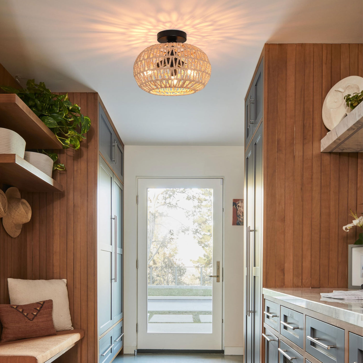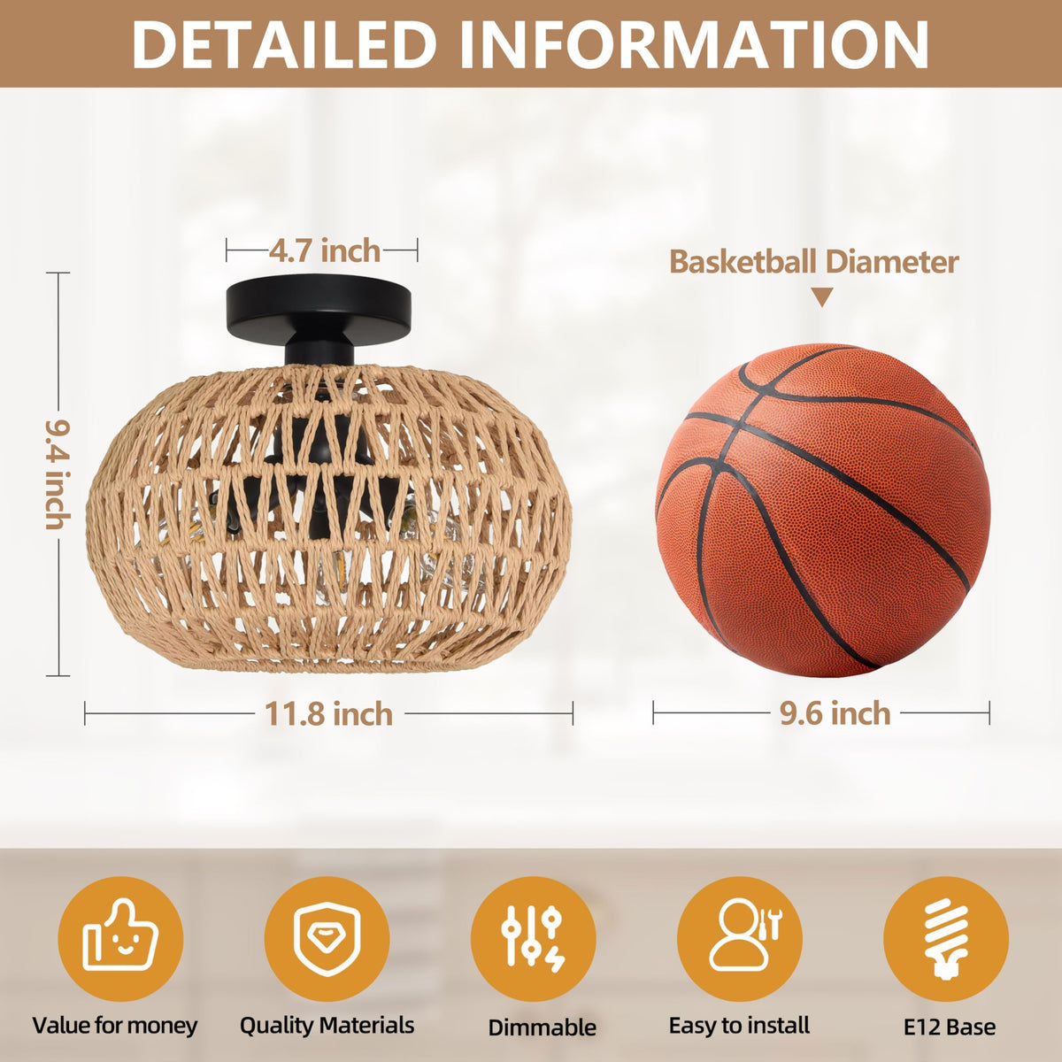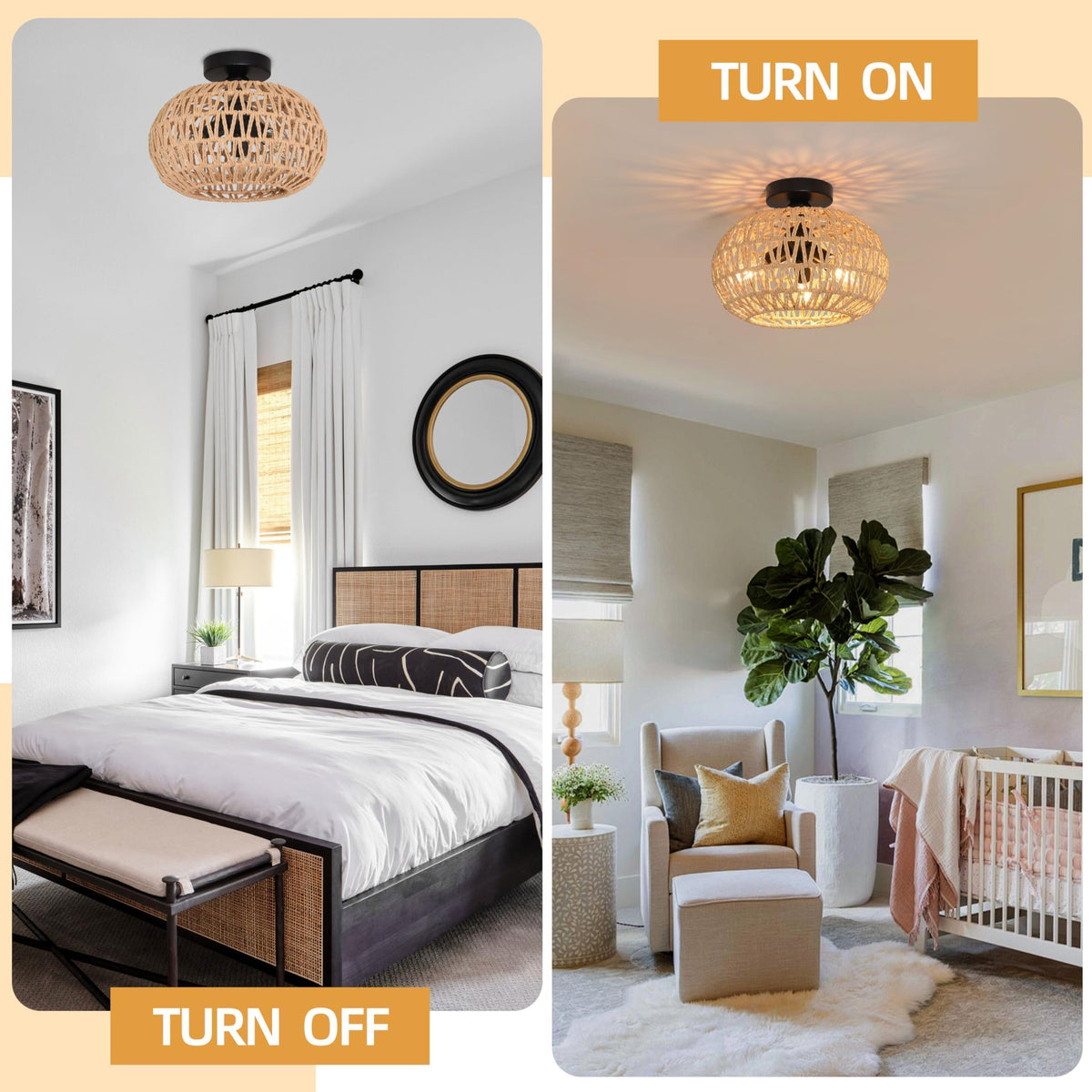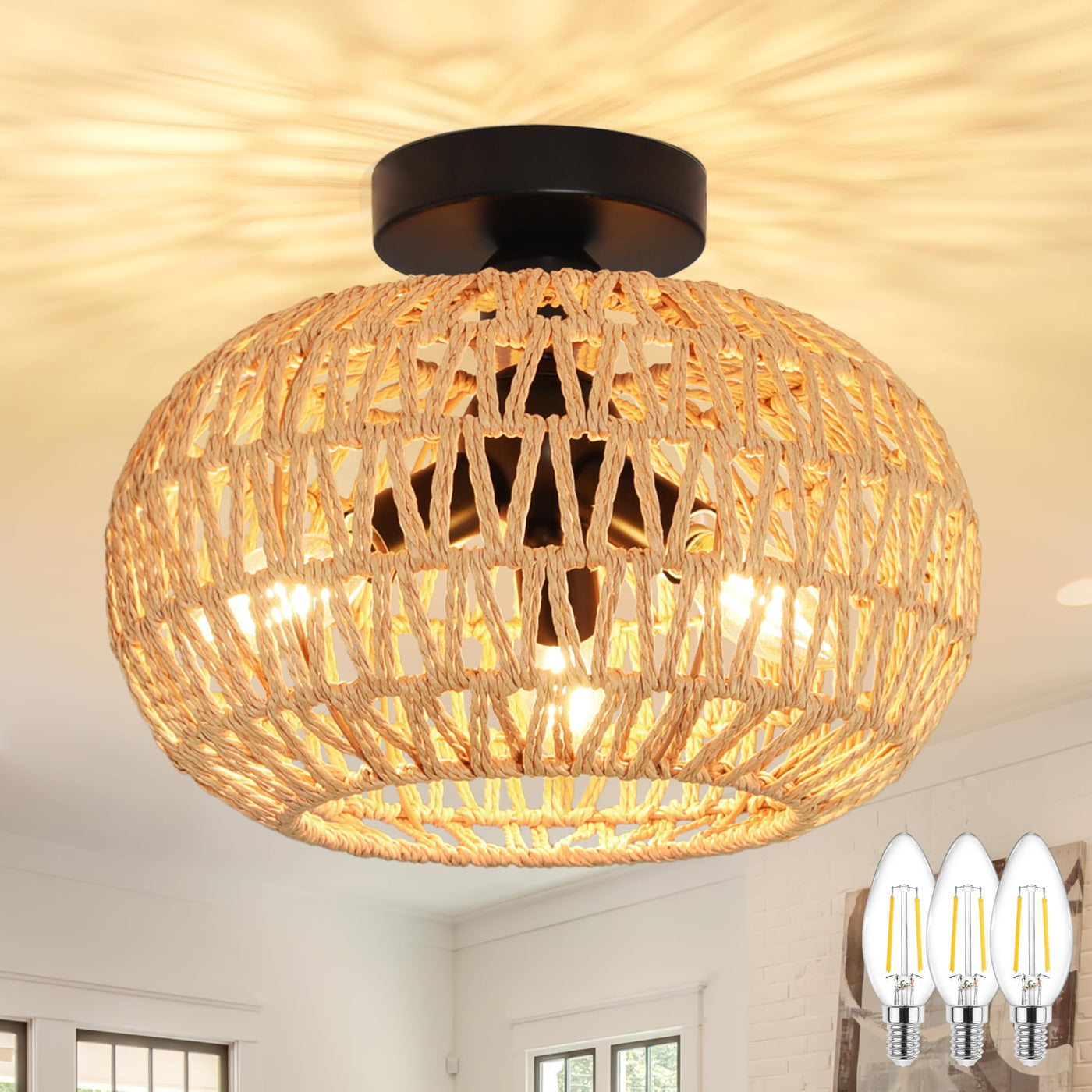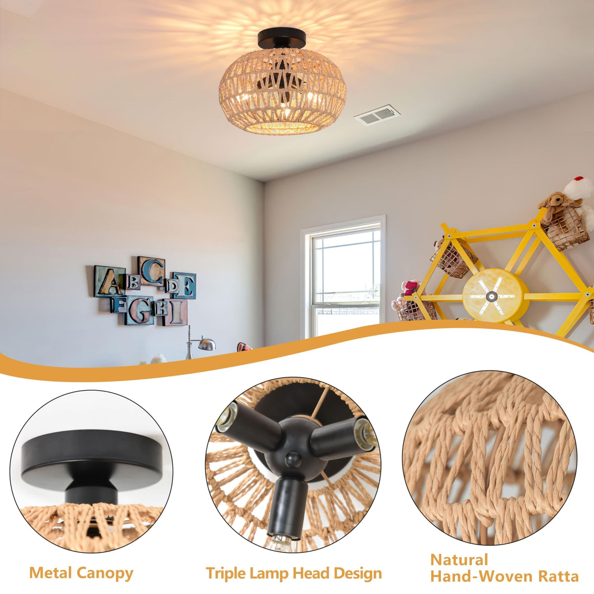 Ayshwilldec 11.8'' Rattan Ceiling Light Boho Light Fixtures Ceiling 3-Lights Boho Semi Flush Mount Ceiling Light Rattan Close To