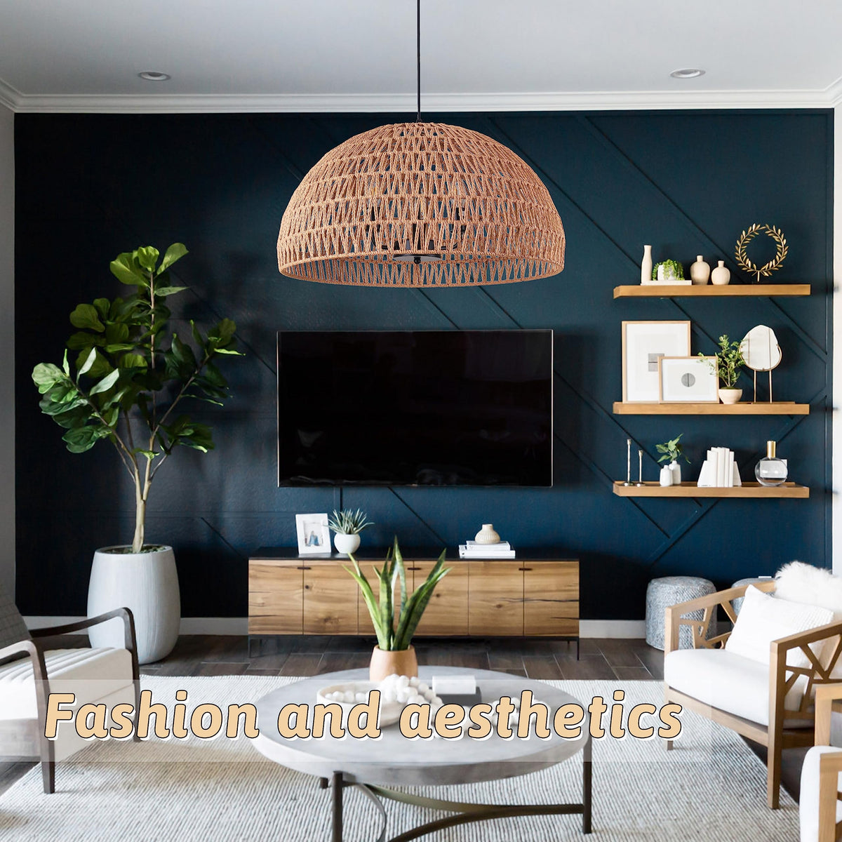 Q: What style of decor does this light fixture complement?A: This brown woven pendant light features a unique boho and rustic design, making it a perfect match for vintage, industrial, and farmhouse-style decor, enhancing any room's atmosphere.