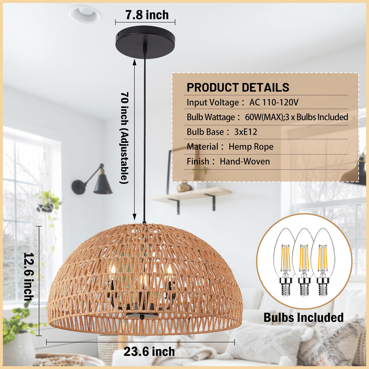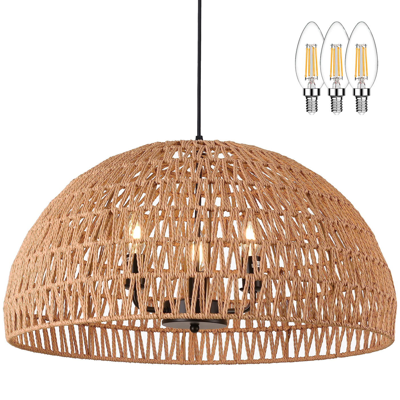 Q: What type of bulbs does the AyshwillDec 24" Brown Woven Pendant Light use?A: The AyshwillDec 24" Brown Woven Pendant Light comes with 3 regular warm white bulbs that have E12 bases included. You can also use dimmable bulbs for adjustable lighting.