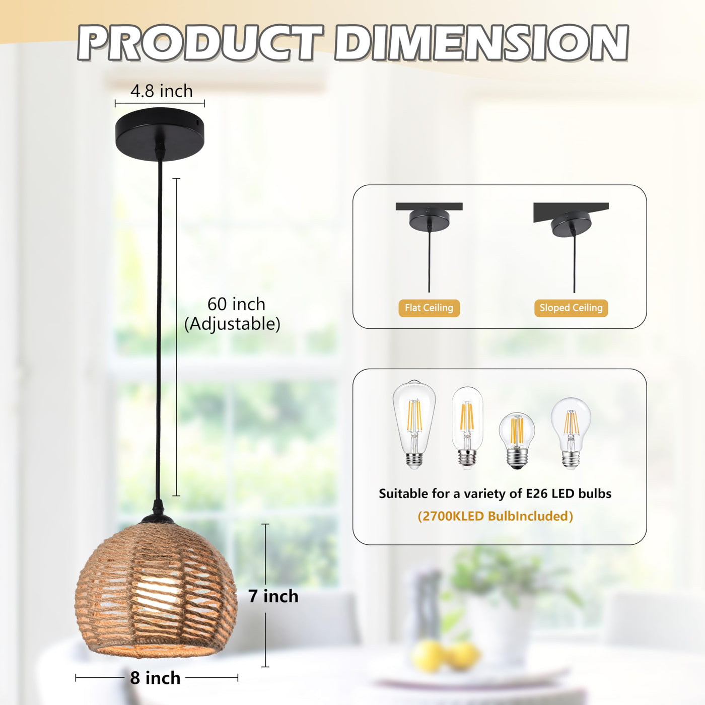 Q: What are the dimensions of the AyshwillDec Woven Pendant Light?A: The AyshwillDec Woven Pendant Light has an overall dimension of 8 inches in width and 7 inches in height. The electric cord is 60 inches long and can be adjusted to suit your lighting needs.