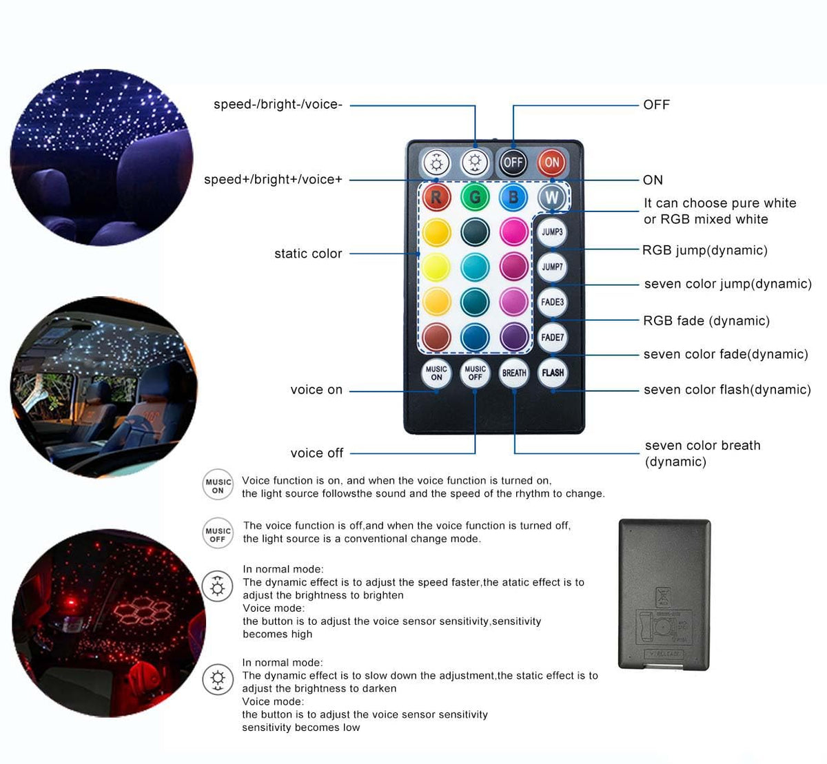 This fiber optic light features a well-made construction with enhanced PMMA optic fiber cables that are soft, flexible, and easy to shape into desired designs. The system includes a 28-key RF remote control, allowing you to effortlessly adjust colors and brightness. With options for voice control, dynamic music synchronization, and various lighting modes, this product offers versatility and ease of use for any occasion.