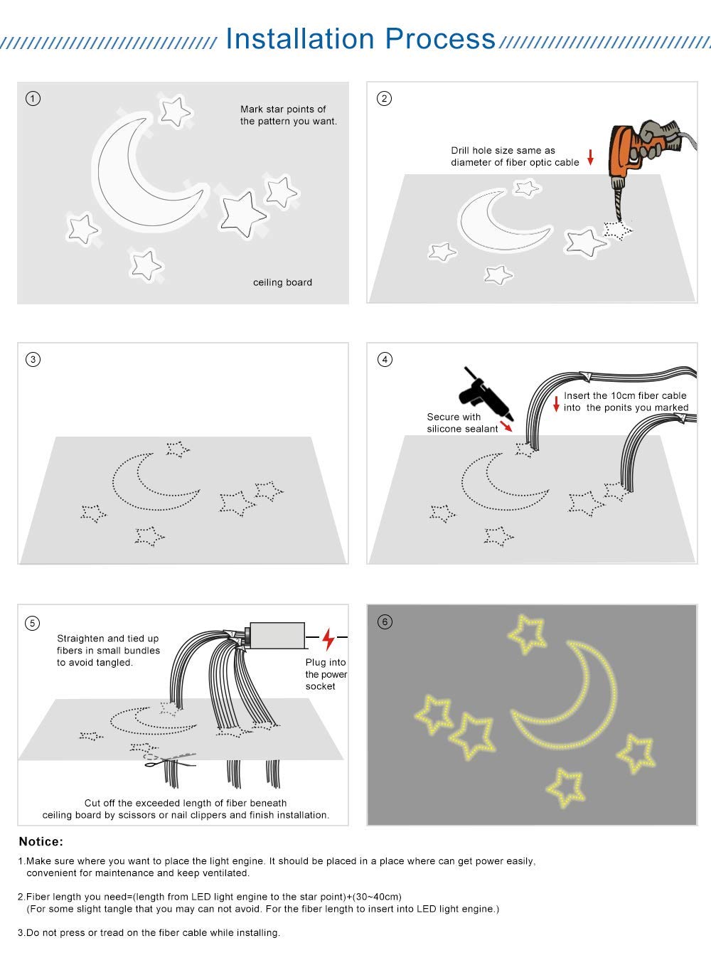 The kit includes enhanced PMMA fiber optic cables, which offer excellent optical conductivity and flexibility for easy design. With multiple lighting modes, including static, dynamic, music sound control, and twinkle effects, you can customize your lighting experience to suit any mood or occasion. This product is ideal for enhancing the decor of bedrooms, KTVs, cars, bars, and clubs.