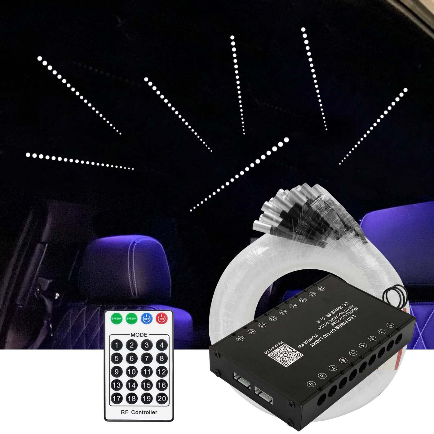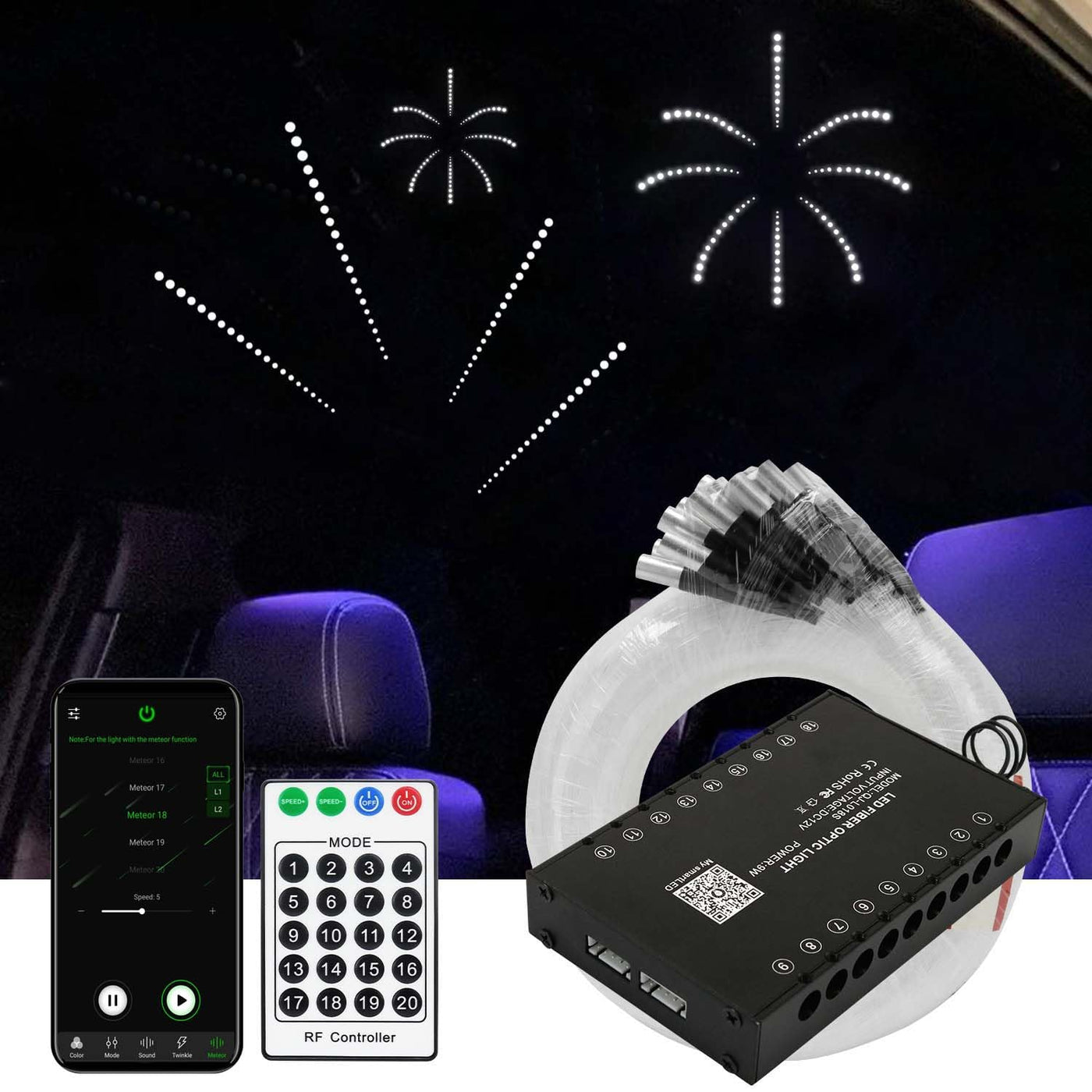 Specification Input voltage:AC86-265V/DC12V POWER: 9W Fiber head inner diameter:7mm Light body material:Aluminum Light color: White Remote: App smart phone&RF remote controlled Remoter dimension: L120× W105 × H24mm Lifetime: 50,000 hours Warranty: 2 years Package included -1 x meteor light engine 1x 18x(8pcs*1mm*4m) fiber optic cables -1 x Power adapter+ -1 x Car use cigarette lighter -1 x 24key RF remote controller -1 x User Manual