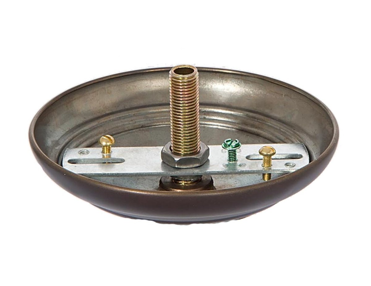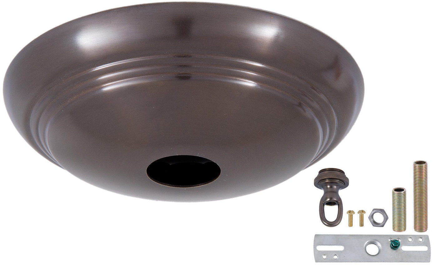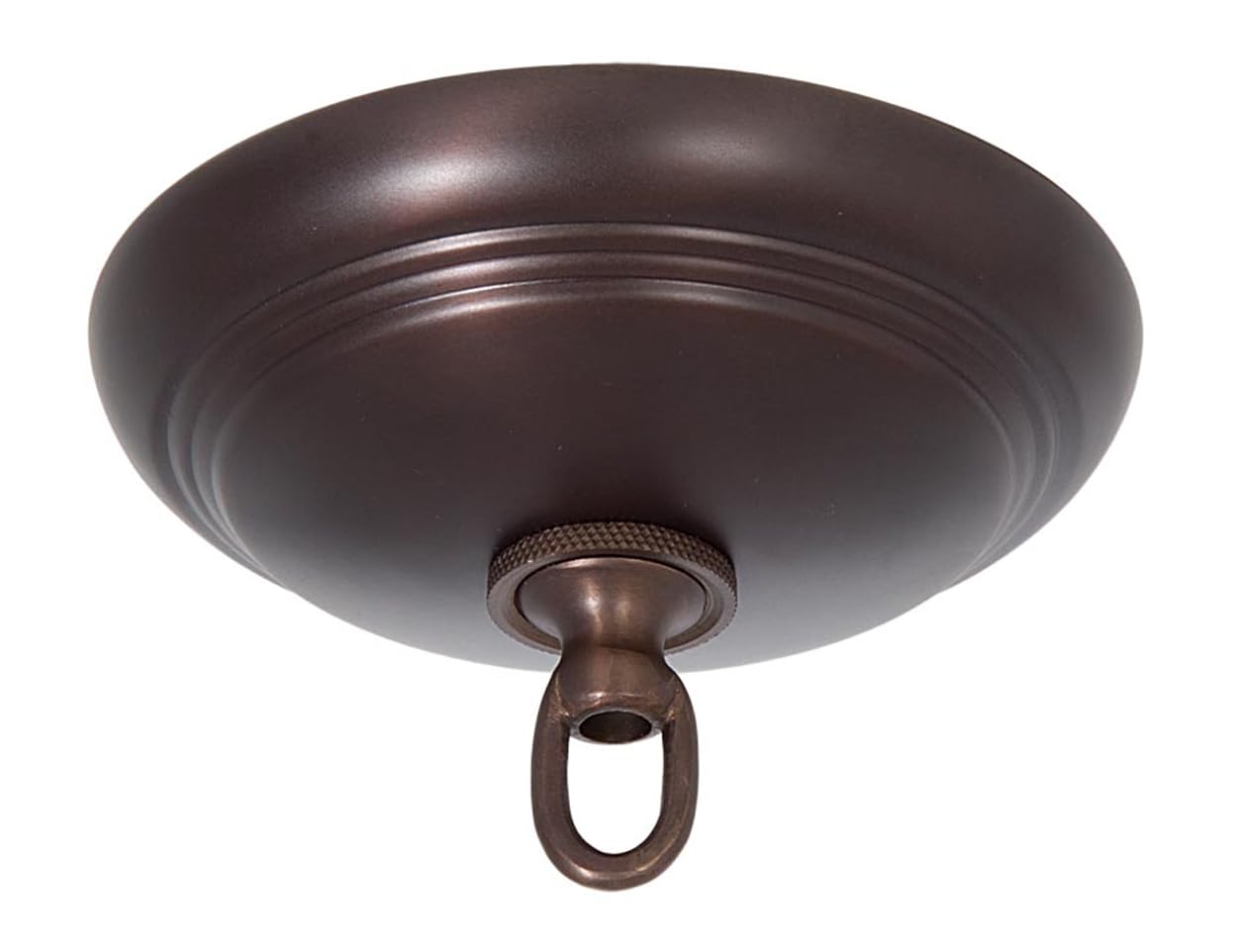 Antique Bronze finish, 5 1/4'' diameter brass canopy with 1 1/16'' I.D. center hole, 1 3 /8'' heigheight Solid, heavy gauge brass canopy with top quality cast brass loop and mounting hdwe. Unassembled.
