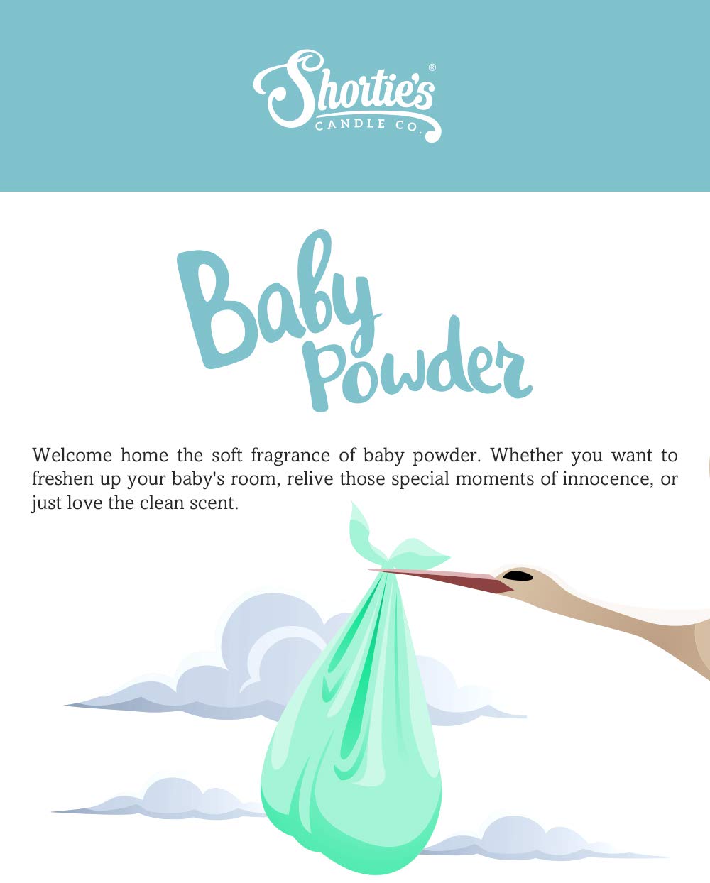 Welcome home the soft, soothing fragrance of baby powder. Whether you want to freshen up your baby's room, relive those special moments of innocence, or just love the clean scent. Our Baby Powder tealight candles feature a beautiful clear container that allows the candle color to shine through brilliantly, and a self trimming natural fiber wick. Our Baby Powder tea lights will add a luminous splash of color to any home decor, or any event big or small! Each 1/2 Oz. tealight burns for 5+ hours, and pack a great scent throw for such a small package. Our classic container wax is composed of a super soft paraffin petrolatum blend with a low melt point making for strong fragrance fast.